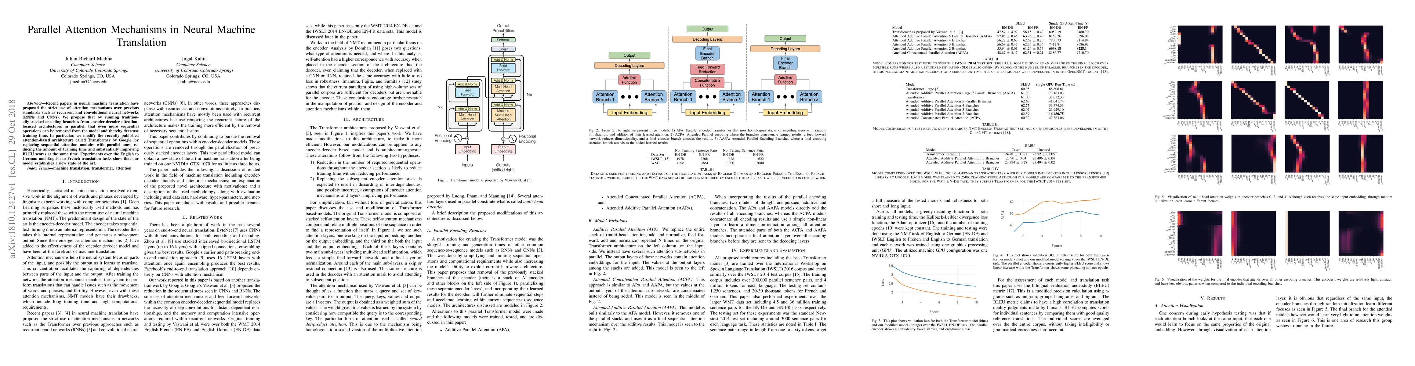 This paper proposes parallel attention mechanisms in neural machine translation to reduce training time and improve BLEU scores. By modifying the Transformer architecture with parallel attention modules, the model achieves state-of-the-art performance on English to German and English to French translation tasks.