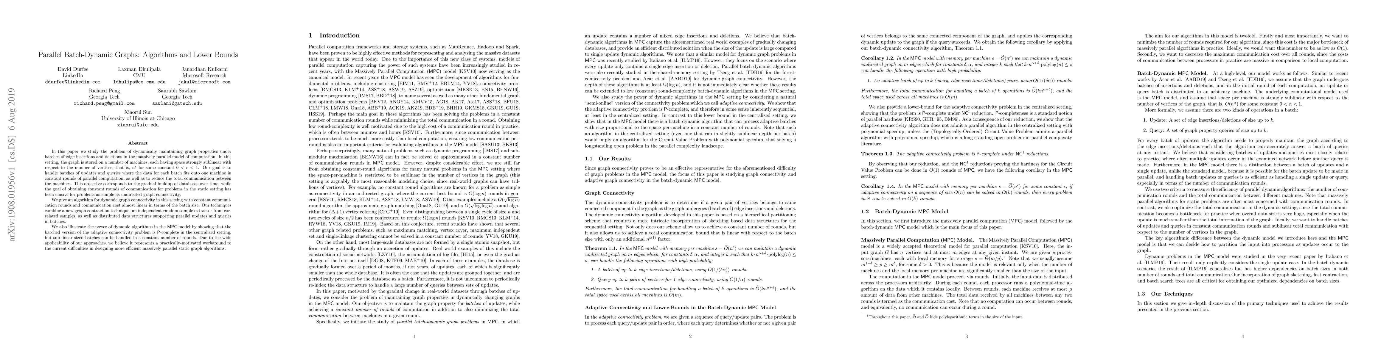 This paper presents algorithms for dynamically maintaining graph properties under batch updates in a massively parallel computation model with sublinear machine space. It introduces an efficient method for dynamic graph connectivity with minimal communication and discusses the $\mathsf{P}$-completeness of adaptive connectivity problems, highlighting the effectiveness of batch processing in reducing computational costs.
