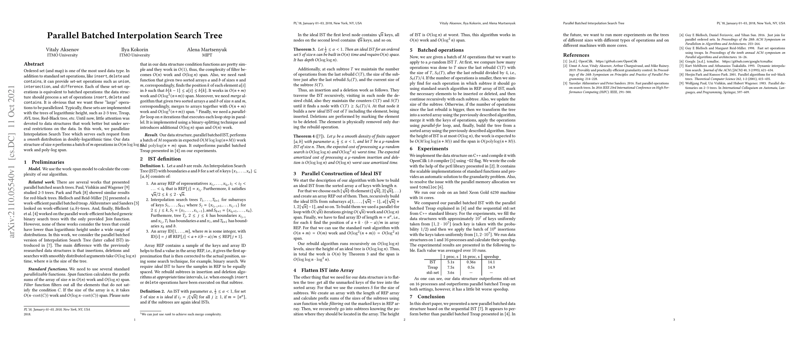 This paper proposes a parallelized version of the Interpolation Search Tree to efficiently handle batched operations on ordered sets, achieving $O(m \log\log n)$ work and poly-log span for processing a batch of $m$ operations. The focus is on optimizing large-scale operations on data structures with logarithmic height.