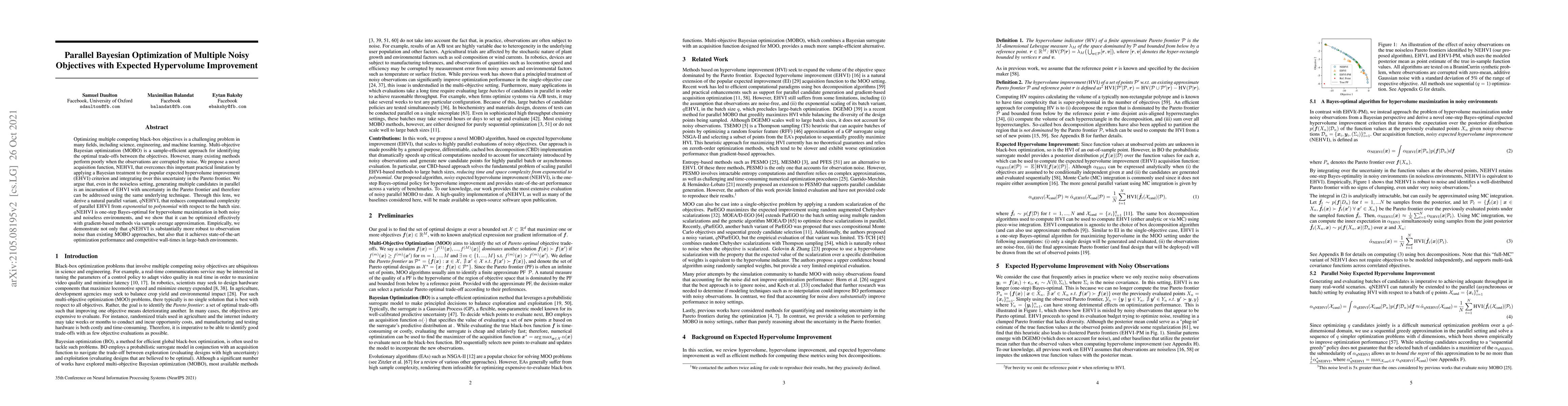 This paper proposes a novel acquisition function, NEHVI, for parallel Bayesian optimization of multiple noisy objectives, addressing the challenge of uncertainty in the Pareto frontier. The method, $q$NEHVI, reduces computational complexity and is shown to be robust to noise while achieving state-of-the-art performance in multi-objective optimization.