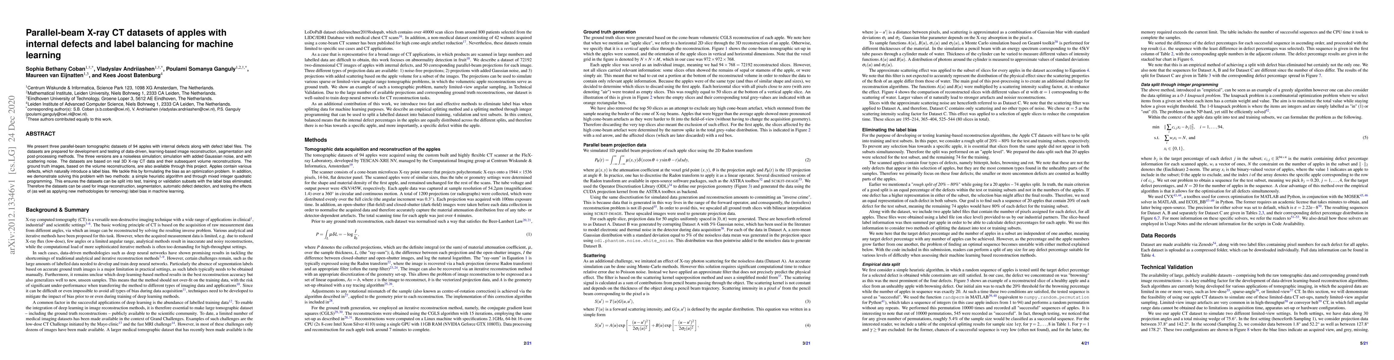 We present three parallel-beam tomographic datasets of 94 apples with internal defects along with defect label files. The datasets are prepared for development and testing of data-driven, learning-based image reconstruction, segmentation and post-processing methods. The three versions are a noiseless simulation; simulation with added Gaussian noise, and with scattering noise. The datasets are based on real 3D X-ray CT data and their subsequent volume reconstructions. The ground truth images, based on the volume reconstructions, are also available through this project. Apples contain various defects, which naturally introduce a label bias. We tackle this by formulating the bias as an optimization problem. In addition, we demonstrate solving this problem with two methods: a simple heuristic algorithm and through mixed integer quadratic programming. This ensures the datasets can be split into test, training or validation subsets with the label bias eliminated. Therefore the datasets can be used for image reconstruction, segmentation, automatic defect detection, and testing the effects of (as well as applying new methodologies for removing) label bias in machine learning.