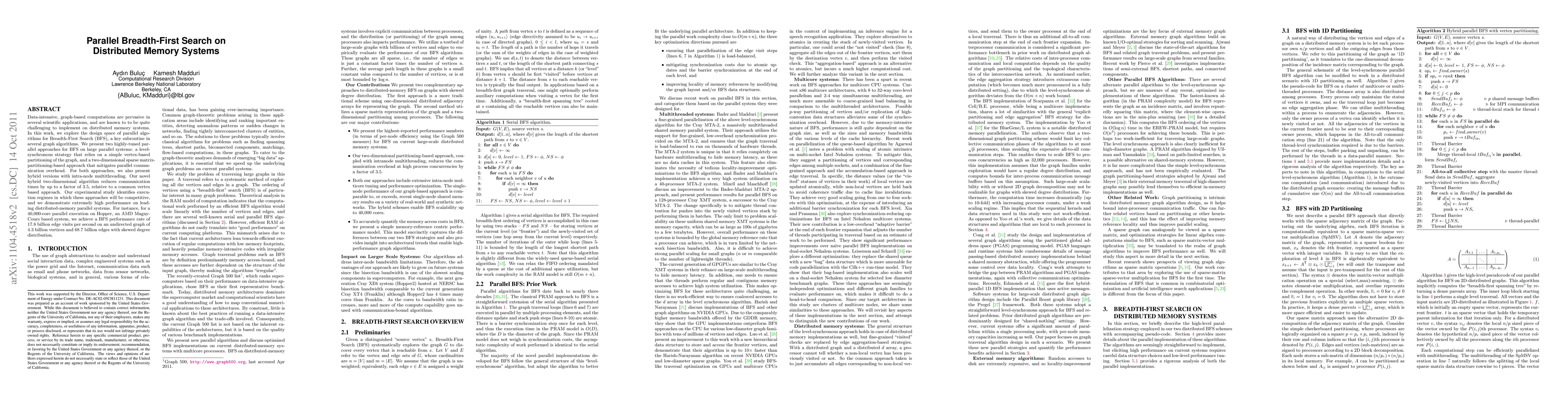 This paper presents parallel algorithms for Breadth-First Search (BFS) on distributed memory systems, introducing level-synchronous and two-dimensional sparse matrix-partitioning strategies. The hybrid two-dimensional approach significantly reduces communication times and achieves high performance, reaching 17.8 billion edge visits per second on a 40,000-core system.