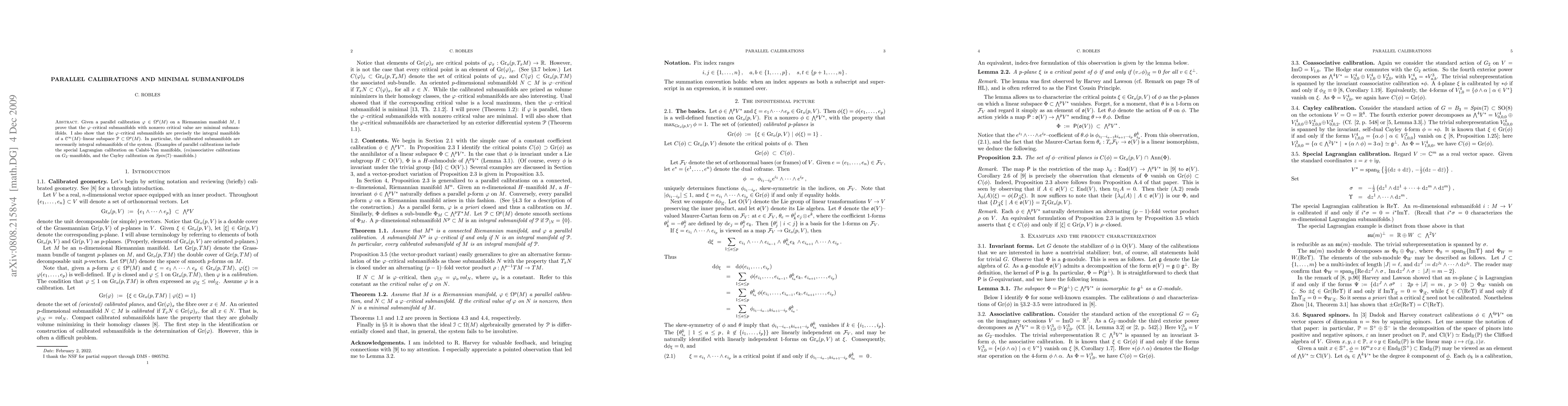 Given a parallel calibration $\phi \in \Omega^p(M)$ on a Riemannian manifold $M$, I prove that the $\phi$--critical submanifolds with nonzero critical value are minimal submanifolds. I also show that the $\phi$--critical submanifolds are precisely the integral manifolds of a $\mathscr{C}^\infty(M)$--linear subspace $\sP \subset \Omega^p(M)$. In particular, the calibrated submanifolds are necessarily integral submanifolds of the system. (Examples of parallel calibrations include the special Lagrangian calibration on Calabi-Yau manifolds, (co)associative calibrations on $G_2$--manifolds, and the Cayley calibration on $\tSpin(7)$--manifolds.)