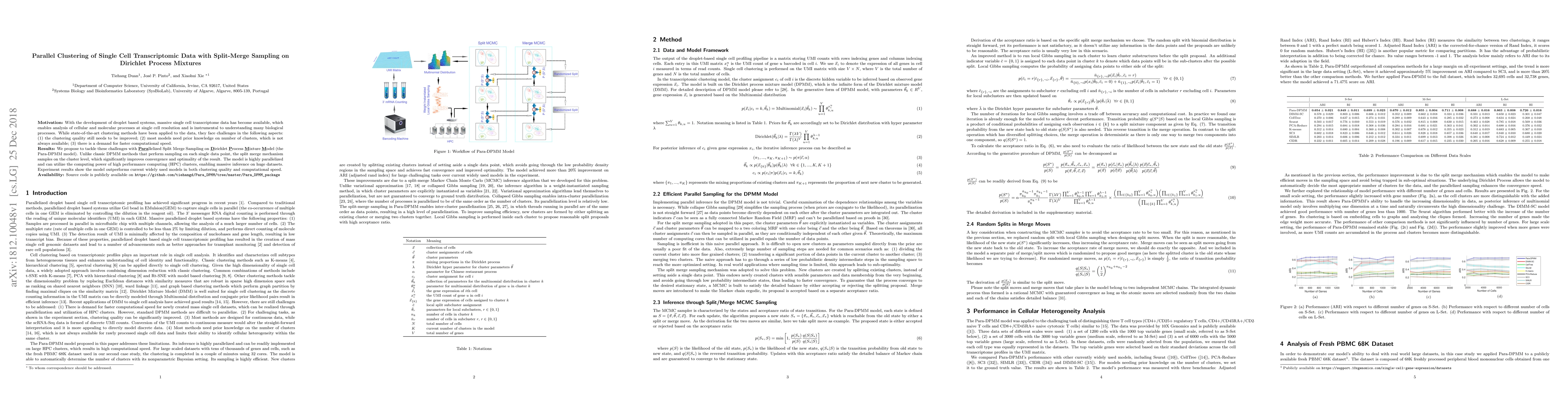 This paper proposes a Parallel Split Merge Sampling on Dirichlet Process Mixture Model (Para-DPMM) to improve clustering of massive single cell transcriptome data. The model enhances clustering quality, does not require prior knowledge of cluster numbers, and significantly speeds up computation, leveraging high-performance computing for large datasets.