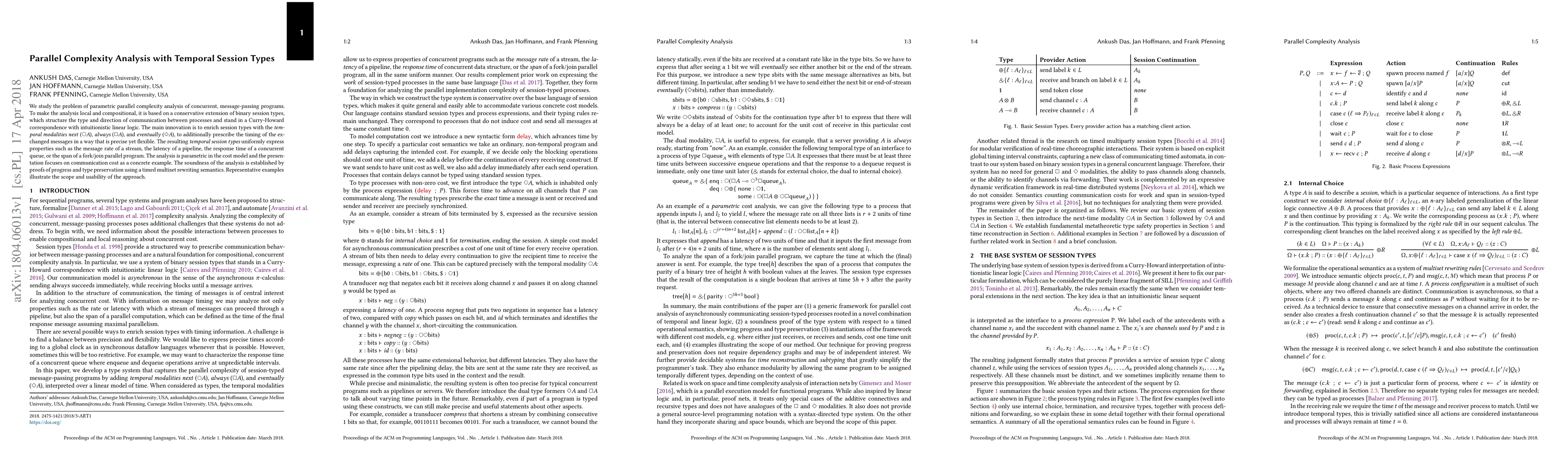 We study the problem of parametric parallel complexity analysis of concurrent, message-passing programs. To make the analysis local and compositional, it is based on a conservative extension of binary session types, which structure the type and direction of communication between processes and stand in a Curry-Howard correspondence with intuitionistic linear logic. The main innovation is to enrich session types with the temporal modalities next ($\bigcirc A$), always ($\Box A$), and eventually ($\Diamond A$), to additionally prescribe the timing of the exchanged messages in a way that is precise yet flexible. The resulting temporal session types uniformly express properties such as the message rate of a stream, the latency of a pipeline, the response time of a concurrent queue, or the span of a fork/join parallel program. The analysis is parametric in the cost model and the presentation focuses on communication cost as a concrete example. The soundness of the analysis is established by proofs of progress and type preservation using a timed multiset rewriting semantics. Representative examples illustrate the scope and usability of the approach.