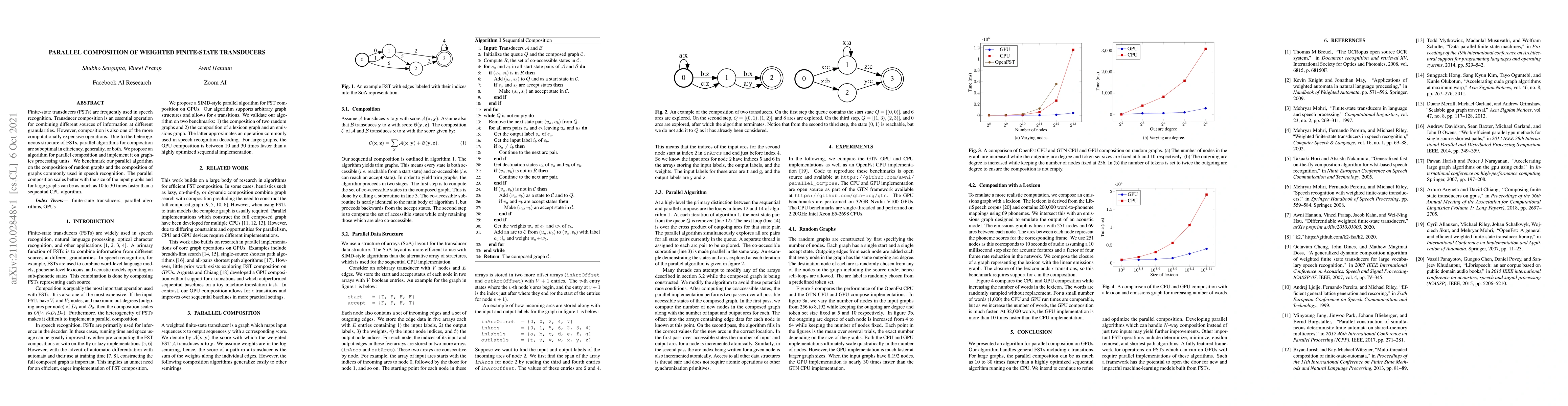 This paper proposes a parallel algorithm for composing weighted finite-state transducers (FSTs) implemented on graphics processing units (GPUs), achieving significant speedups—up to 10 to 30 times faster—compared to sequential CPU algorithms, especially for large graphs. The method addresses the computational inefficiencies of traditional parallel composition methods.