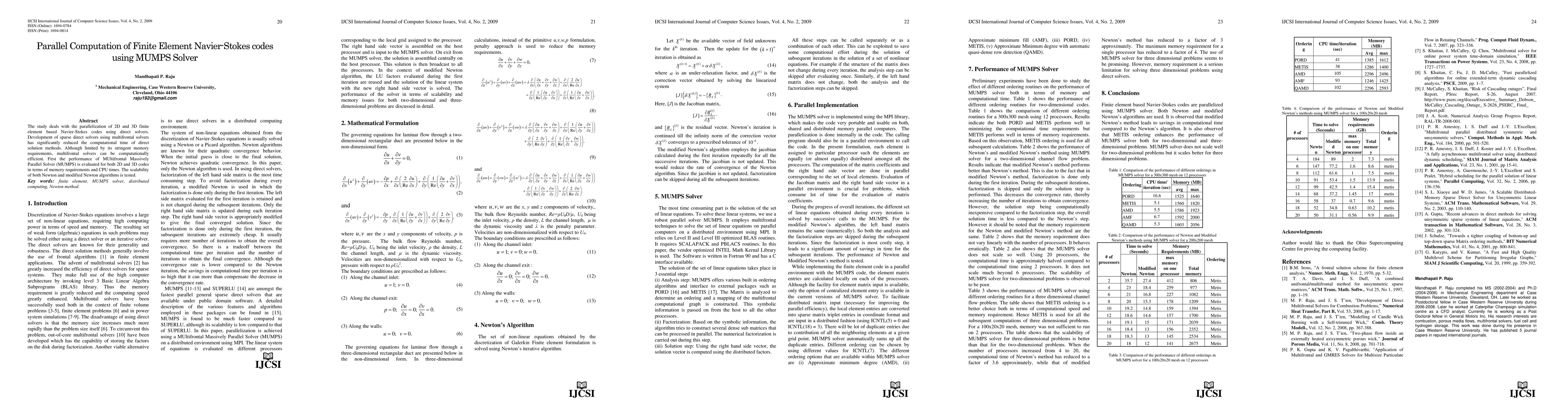 This paper evaluates the parallel computation of 2D and 3D finite element Navier-Stokes codes using the MUMPS solver, assessing its performance in terms of memory and CPU time. The study tests the scalability of both Newton and modified Newton algorithms for parallel efficiency.