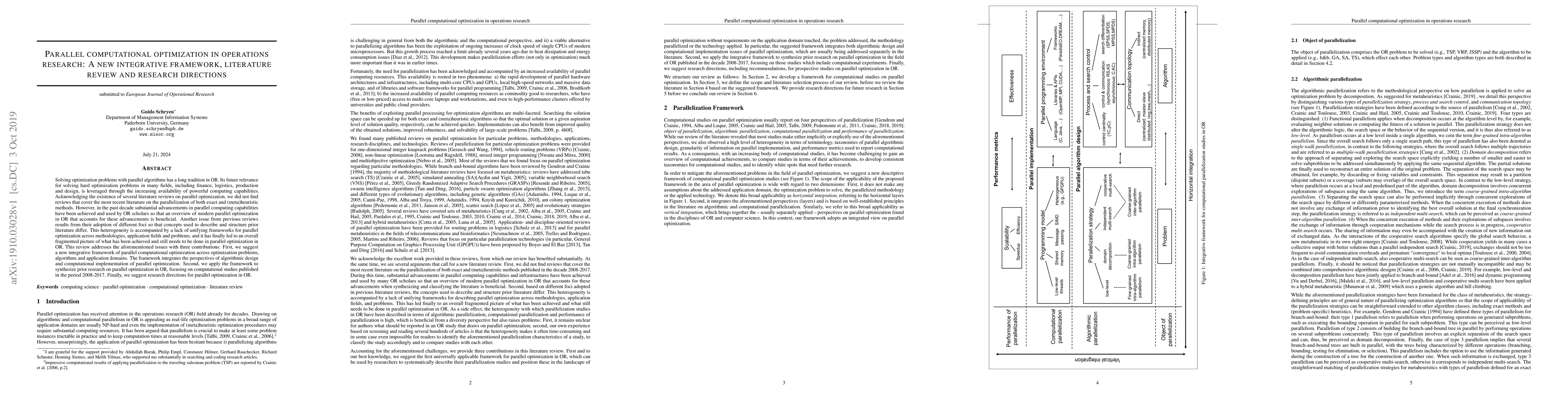 This paper proposes a new integrative framework for parallel computational optimization in operations research, synthesizing recent literature (2008-2017) and suggesting research directions to address the fragmented understanding of parallel optimization across methodologies and application fields.
