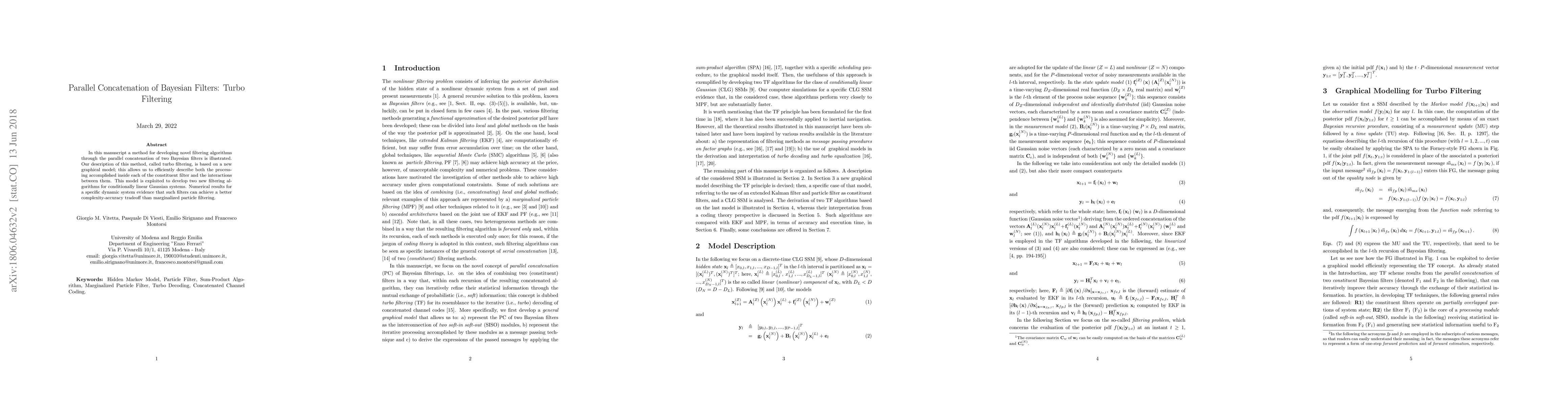 This paper introduces turbo filtering, a novel method for developing advanced filtering algorithms by parallelly concatenating two Bayesian filters. The approach leverages a new graphical model to efficiently describe interactions between filters, resulting in improved complexity-accuracy tradeoffs compared to marginalized particle filtering.