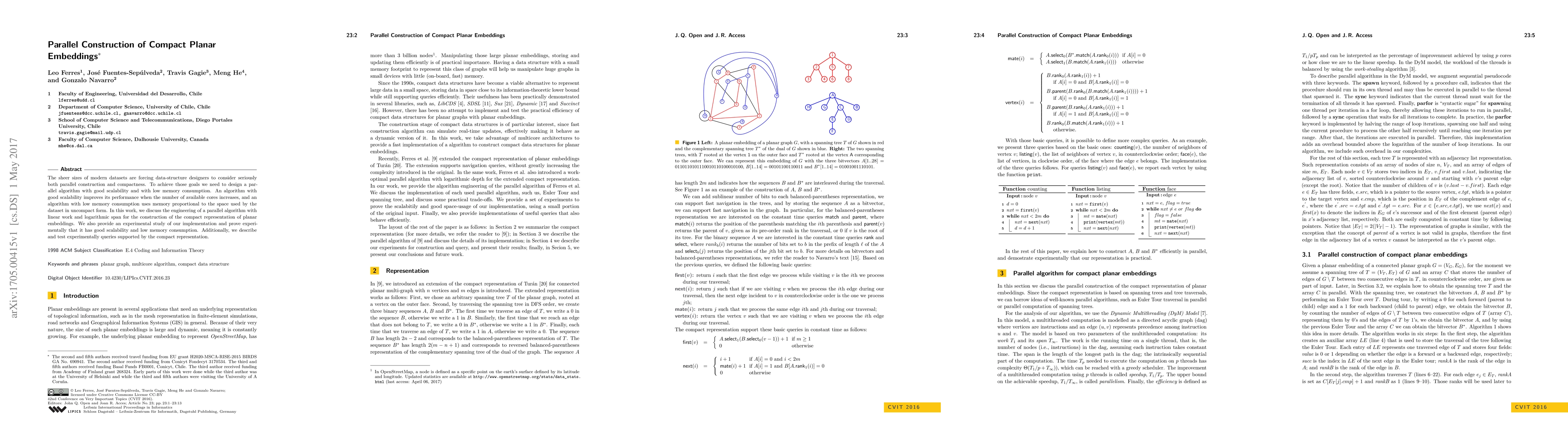The sheer sizes of modern datasets are forcing data-structure designers to consider seriously both parallel construction and compactness. To achieve those goals we need to design a parallel algorithm with good scalability and with low memory consumption. An algorithm with good scalability improves its performance when the number of available cores increases, and an algorithm with low memory consumption uses memory proportional to the space used by the dataset in uncompact form. In this work, we discuss the engineering of a parallel algorithm with linear work and logarithmic span for the construction of the compact representation of planar embeddings. We also provide an experimental study of our implementation and prove experimentally that it has good scalability and low memory consumption. Additionally, we describe and test experimentally queries supported by the compact representation.