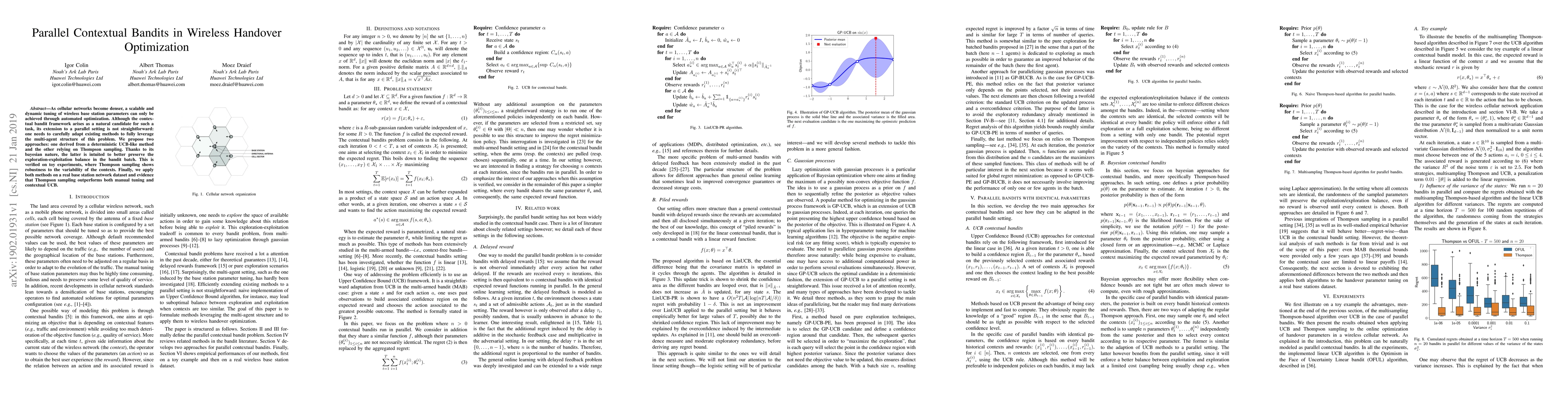 Researchers propose two approaches to optimize wireless base station parameters in dense cellular networks using parallel contextual bandit methods, with Thompson sampling shown to outperform manual tuning and contextual UCB in real-world applications.