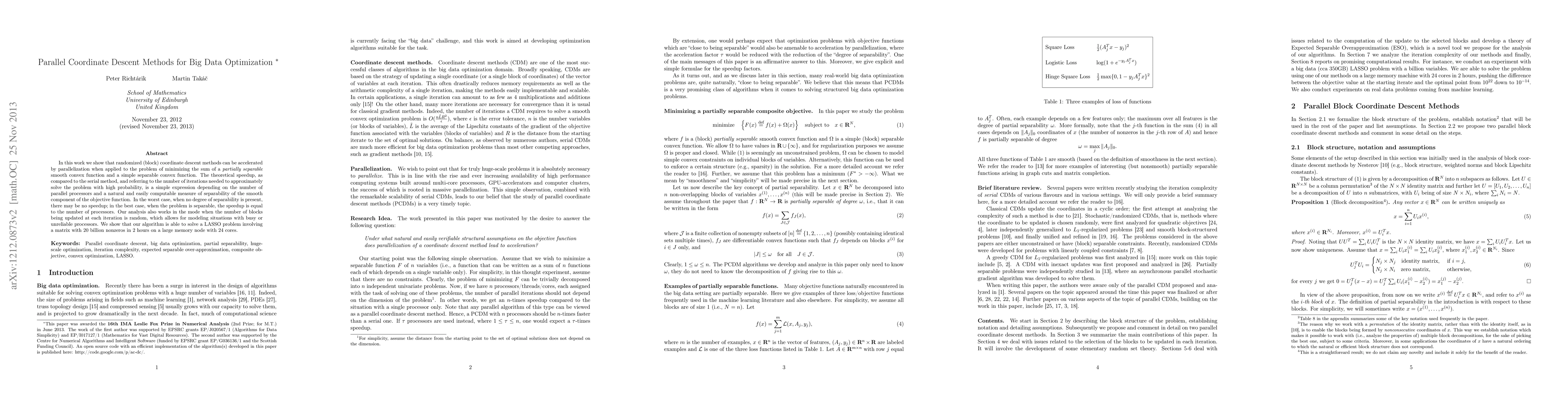 Researchers show that parallelizing coordinate descent methods can significantly speed up optimization for big data problems, with theoretical speedup depending on the number of processors and problem separability, achieving a 2-hour solution time for a 20 billion nonzeros LASSO problem on a large memory node with 24 cores.