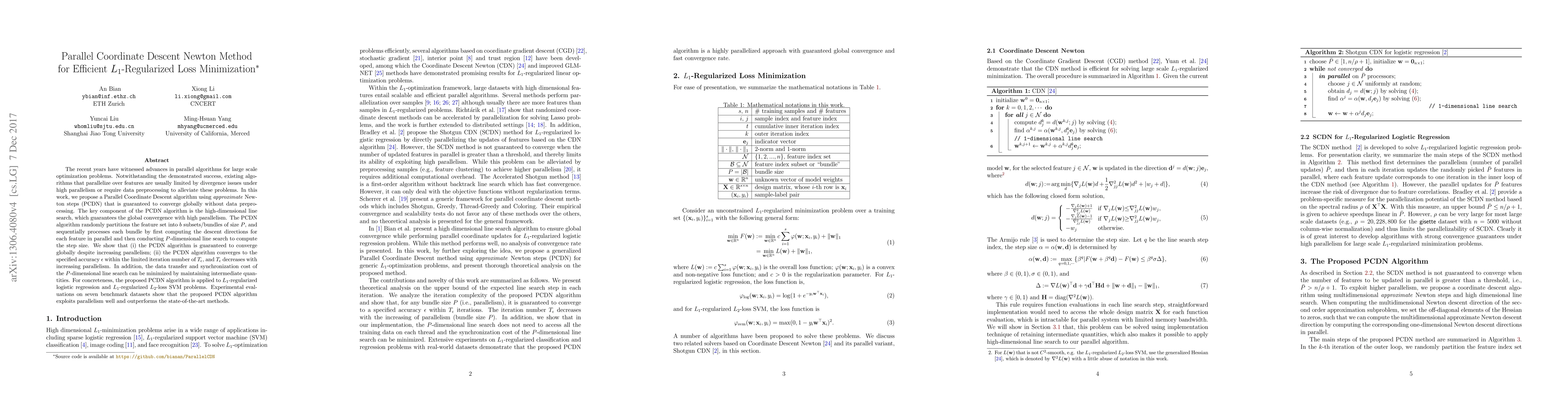 This paper proposes a Parallel Coordinate Descent Newton (PCDN) method for efficient $\ell_1$-regularized minimization, which guarantees global convergence and improved accuracy with increased parallelism. The PCDN algorithm partitions features into bundles, computes descent directions in parallel, and minimizes data transfer costs, outperforming state-of-the-art methods in speed on benchmark datasets.