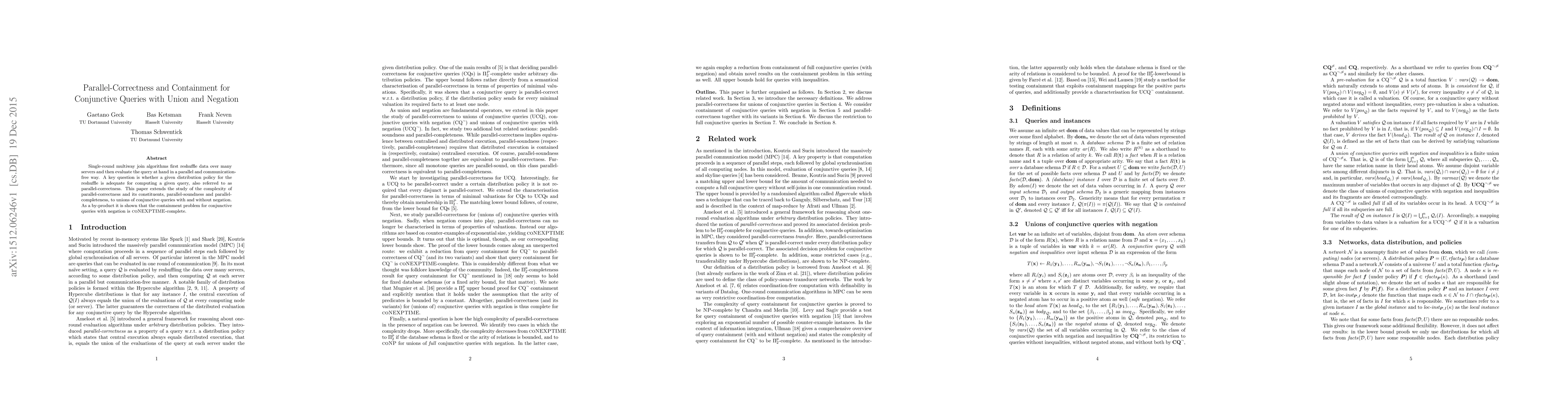 This paper investigates the parallel-correctness of multiway join algorithms for conjunctive queries with union and negation, establishing the complexity of parallel-soundness and parallel-completeness. It also demonstrates that the containment problem for such queries is coNEXPTIME-complete.