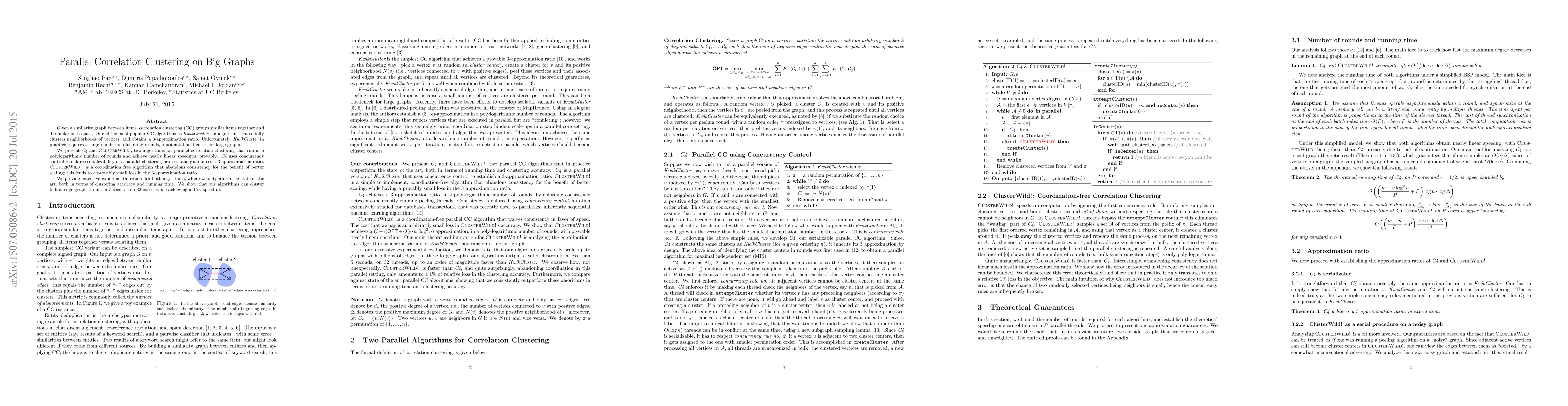 This paper introduces C4 and ClusterWild!, two parallel algorithms for correlation clustering on large graphs, achieving polylogarithmic round complexity and nearly linear speedups. Both algorithms outperform existing methods in terms of accuracy and runtime, clustering billion-edge graphs in under 5 seconds on 32 cores.