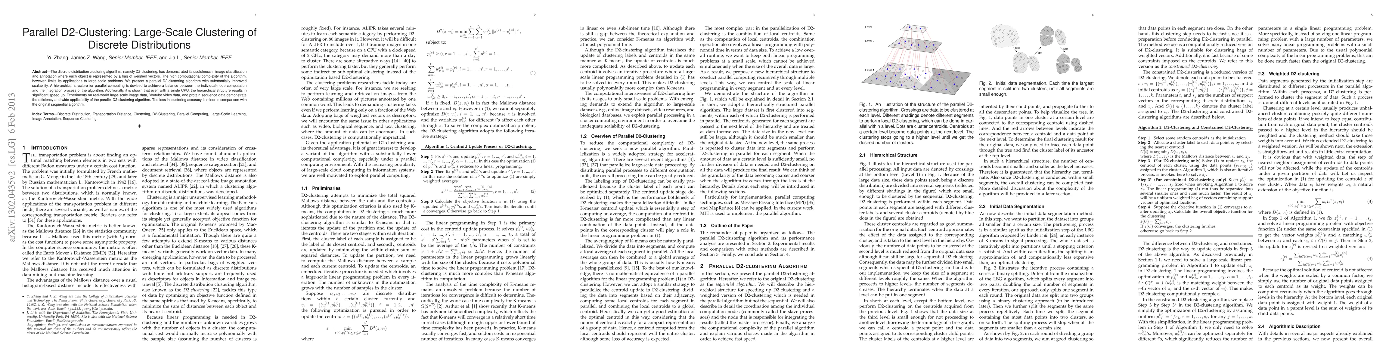 This paper introduces a parallel version of D2-clustering to enhance scalability for large-scale discrete distribution clustering, demonstrating significant speed-up and efficiency across various datasets while maintaining minor loss in accuracy.