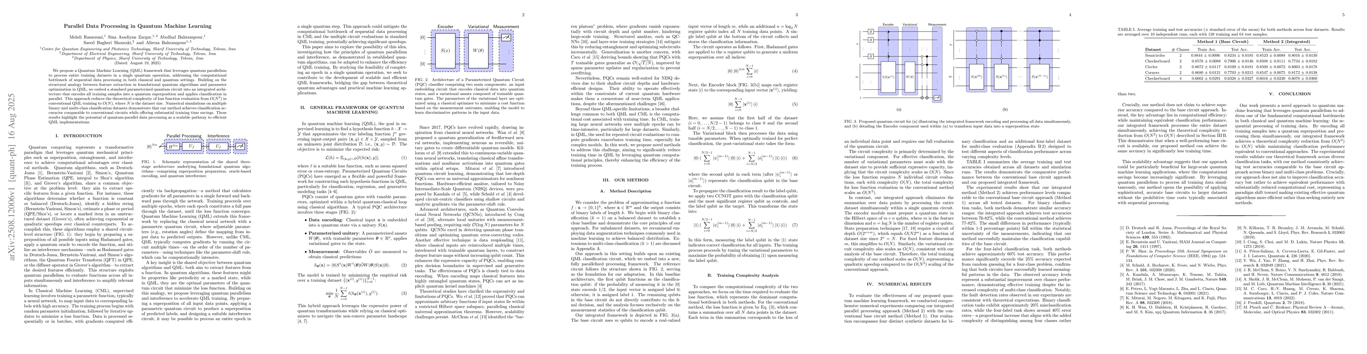 We propose a Quantum Machine Learning (QML) framework that leverages quantum parallelism to process entire training datasets in a single quantum operation, addressing the computational bottleneck of sequential data processing in both classical and quantum settings. Building on the structural analogy between feature extraction in foundational quantum algorithms and parameter optimization in QML, we embed a standard parameterized quantum circuit into an integrated architecture that encodes all training samples into a quantum superposition and applies classification in parallel. This approach reduces the theoretical complexity of loss function evaluation from $O(N^2)$ in conventional QML training to $O(N)$, where $N$ is the dataset size. Numerical simulations on multiple binary and multi-class classification datasets demonstrate that our method achieves classification accuracies comparable to conventional circuits while offering substantial training time savings. These results highlight the potential of quantum-parallel data processing as a scalable pathway to efficient QML implementations.