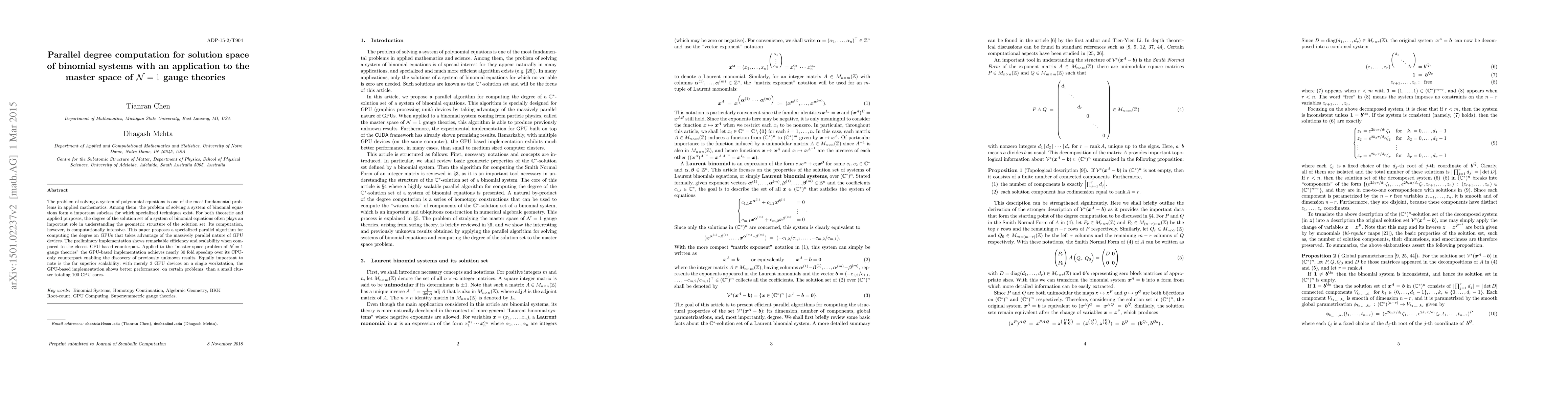 A parallel algorithm on GPUs computes the degree of solution sets for binomial systems with significant speedup, achieving nearly 30-fold performance over CPU-based methods.