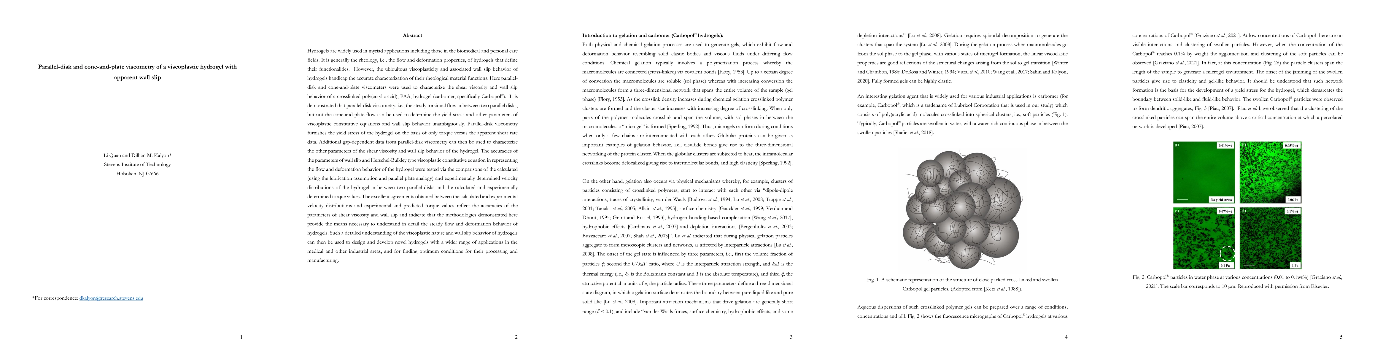 This paper investigates the rheological properties of a viscoplastic hydrogel using parallel-disk and cone-and-plate viscometry, demonstrating that parallel-disk viscometry can accurately determine yield stress and wall slip behavior, while cone-and-plate viscometry cannot. The study provides a detailed understanding of the hydrogel's flow and deformation behavior, which can inform the design of new hydrogels for various applications.