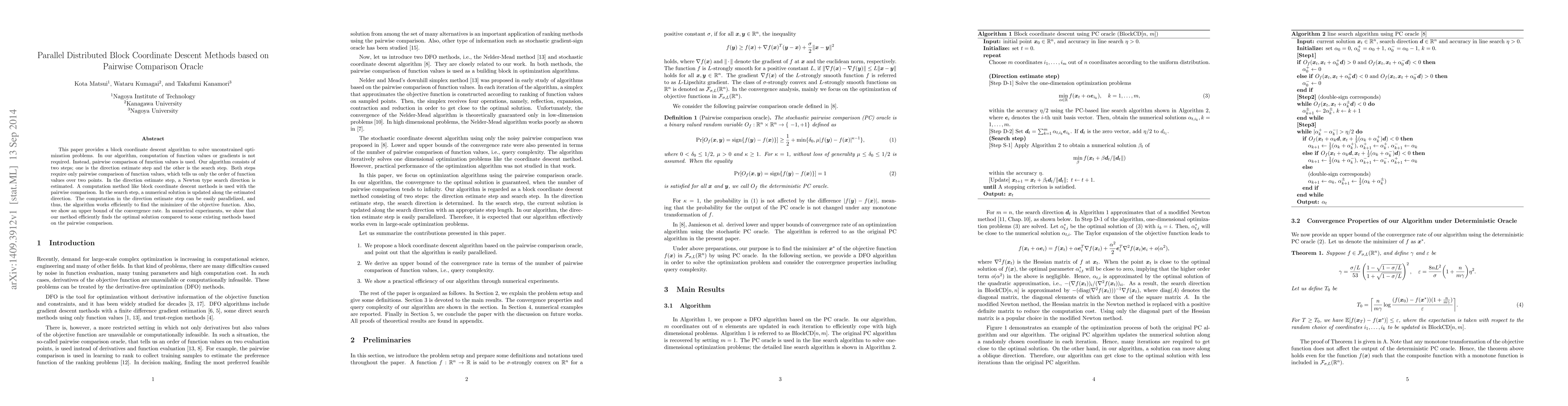 This paper introduces a parallel distributed block coordinate descent algorithm that relies on pairwise comparison of function values rather than explicit computation of function values or gradients. The algorithm efficiently finds the minimizer of an objective function through parallelizable direction estimation and search steps, demonstrating competitive performance in numerical experiments.