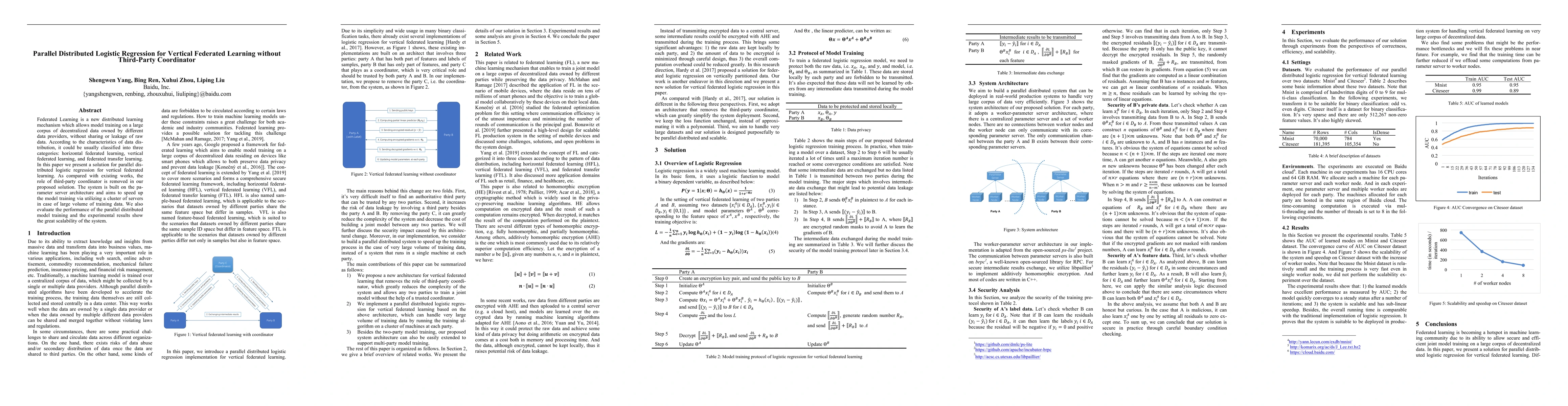 This paper proposes a parallel distributed logistic regression method for vertical federated learning that eliminates the need for a third-party coordinator. The system leverages a parameter server architecture and a cluster of servers to enhance scalability and speed up model training on decentralized data.