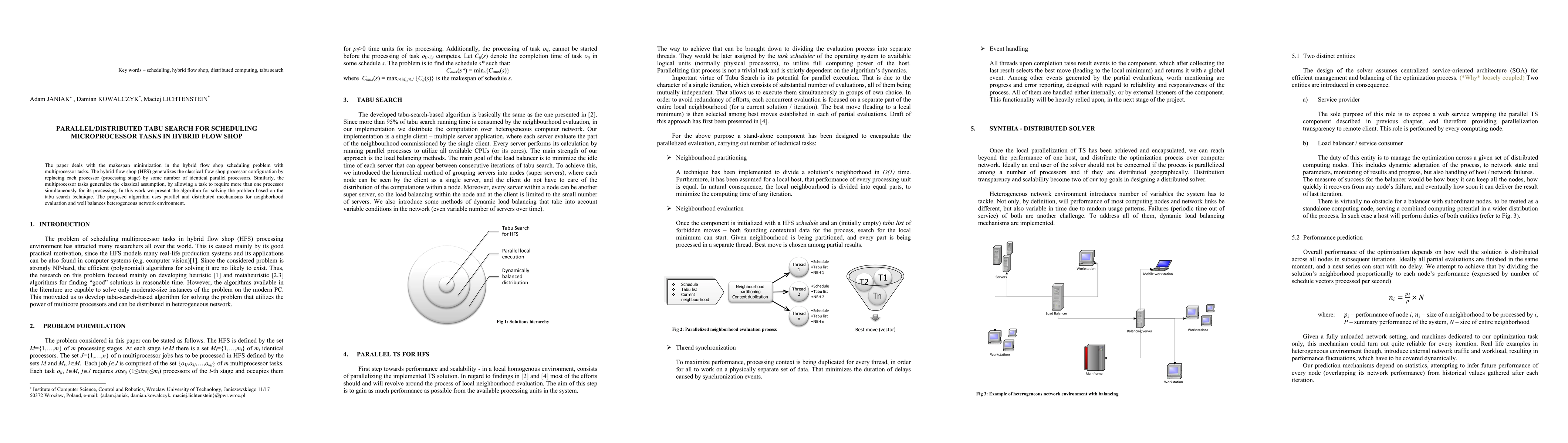 The paper introduces a distributed tabu search framework with dynamic load balancing, performance prediction, and fault tolerance mechanisms for solving hybrid flow shop scheduling problems with multiprocessor tasks.