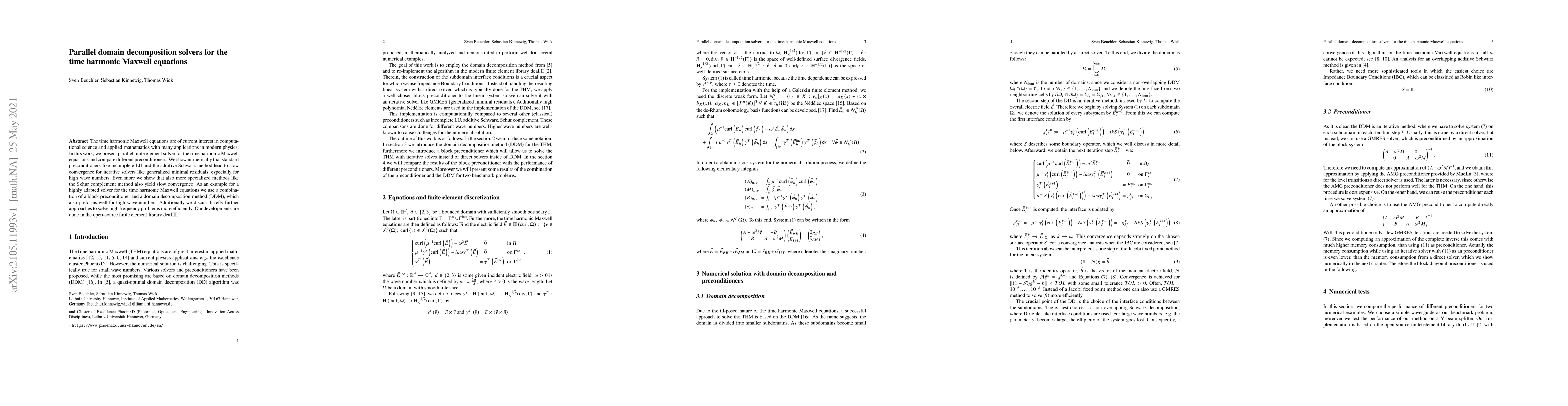 This research introduces a parallel finite element solver for the time harmonic Maxwell equations, focusing on domain decomposition methods. It compares various preconditioners, showing that standard and specialized methods often converge slowly for high wave numbers, while a combination of block preconditioners and domain decomposition performs better. The work is implemented in the open-source finite element library deal.II.