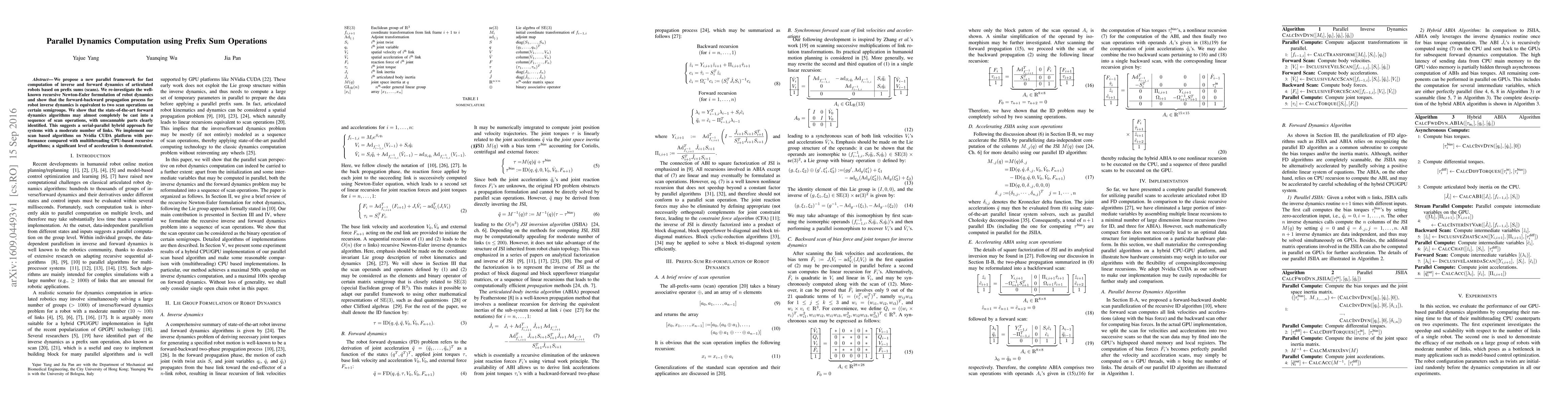 This paper introduces a parallel framework for computing inverse and forward dynamics in articulated robots using prefix sum operations. It demonstrates that the forward-backward propagation in inverse dynamics can be efficiently implemented via scan operations, leading to significant performance improvements over traditional CPU-based recursive algorithms when executed on GPU platforms.