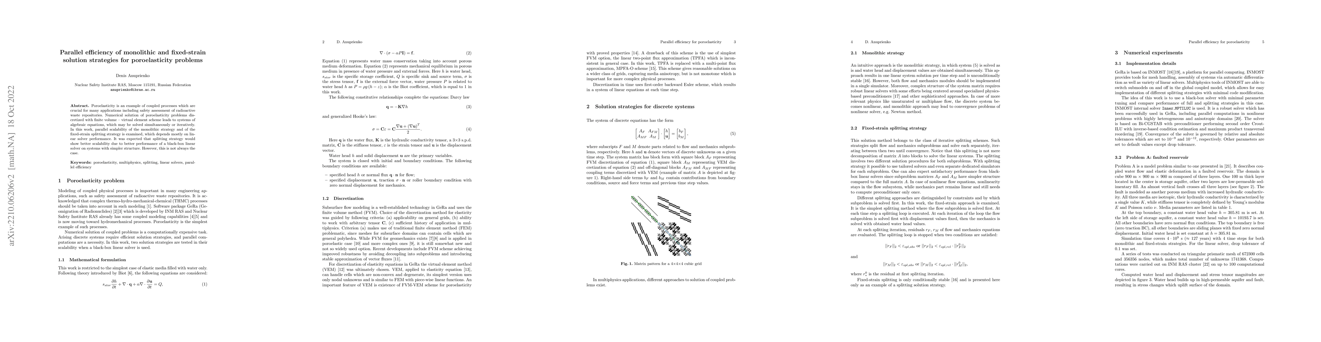 Poroelasticity is an example of coupled processes which are crucial for many applications including safety assessment of radioactive waste repositories. Numerical solution of poroelasticity problems discretized with finite volume -- virtual element scheme leads to systems of algebraic equations, which may be solved simultaneously or iteratively. In this work, parallel scalability of the monolithic strategy and of the fixed-strain splitting strategy is examined, which depends mostly on linear solver performance. It was expected that splitting strategy would show better scalability due to better performance of a black-box linear solver on systems with simpler structure. However, this is not always the case.