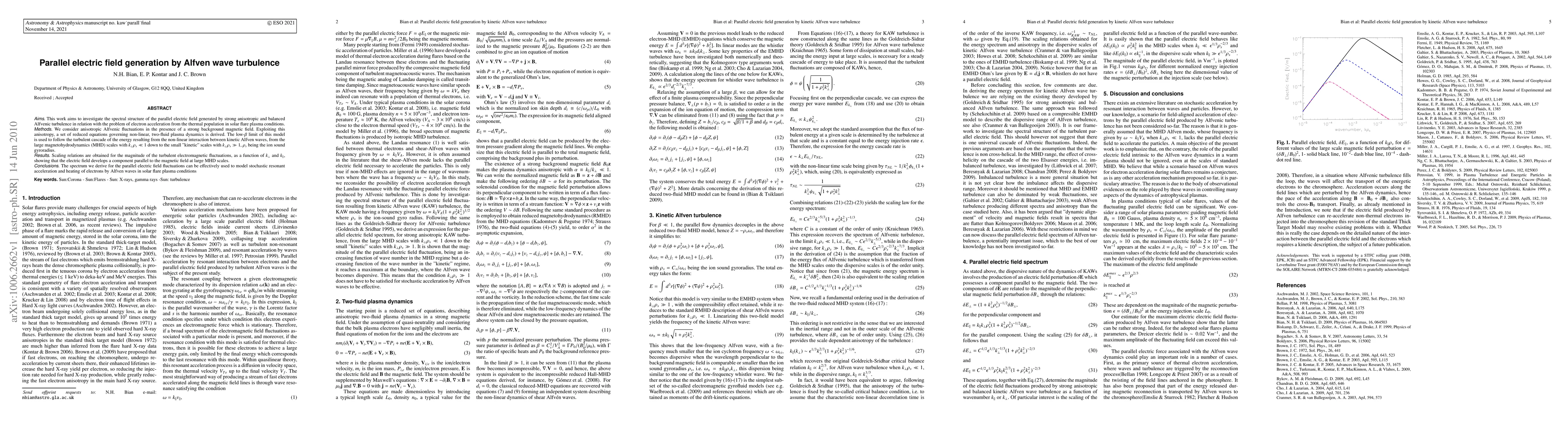 This paper investigates the spectral structure of parallel electric fields generated by Alfven wave turbulence, focusing on electron acceleration in solar flare plasmas. It derives scaling relations for turbulent electromagnetic fluctuations, showing that the electric field develops parallel components at large magnetohydrodynamics scales, which can model electron heating by Alfven waves.