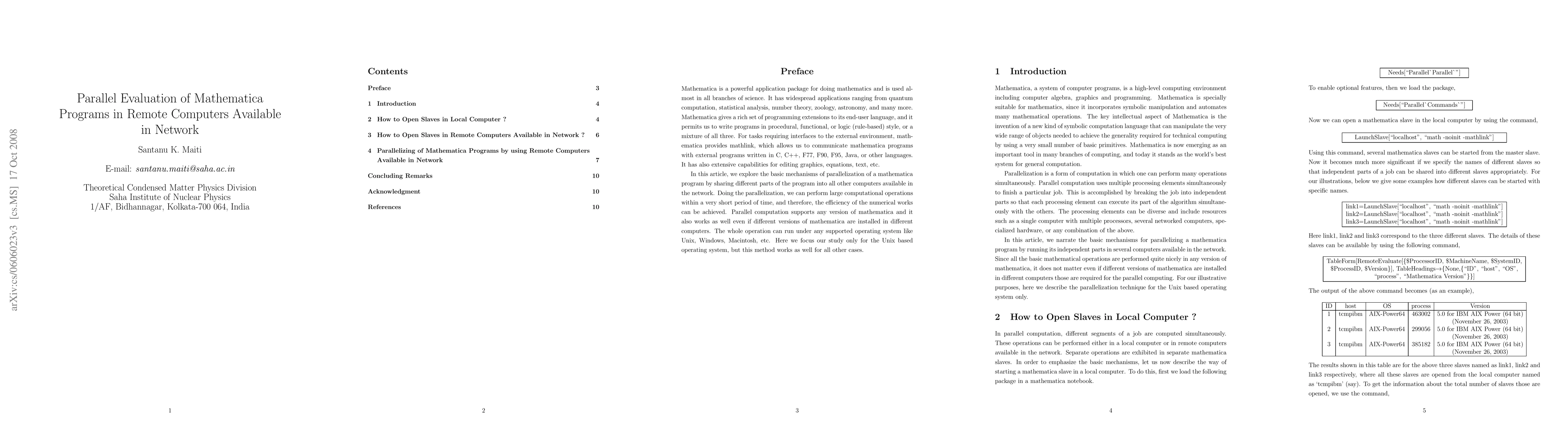Mathematica is a powerful application package for doing mathematics and is used almost in all branches of science. It has widespread applications ranging from quantum computation, statistical analysis, number theory, zoology, astronomy, and many more. Mathematica gives a rich set of programming extensions to its end-user language, and it permits us to write programs in procedural, functional, or logic (rule-based) style, or a mixture of all three. For tasks requiring interfaces to the external environment, mathematica provides mathlink, which allows us to communicate mathematica programs with external programs written in C, C++, F77, F90, F95, Java, or other languages. It has also extensive capabilities for editing graphics, equations, text, etc. In this article, we explore the basic mechanisms of parallelization of a mathematica program by sharing different parts of the program into all other computers available in the network. Doing the parallelization, we can perform large computational operations within a very short period of time, and therefore, the efficiency of the numerical works can be achieved. Parallel computation supports any version of mathematica and it also works as well even if different versions of mathematica are installed in different computers. The whole operation can run under any supported operating system like Unix, Windows, Macintosh, etc. Here we focus our study only for the Unix based operating system, but this method works as well for all other cases.