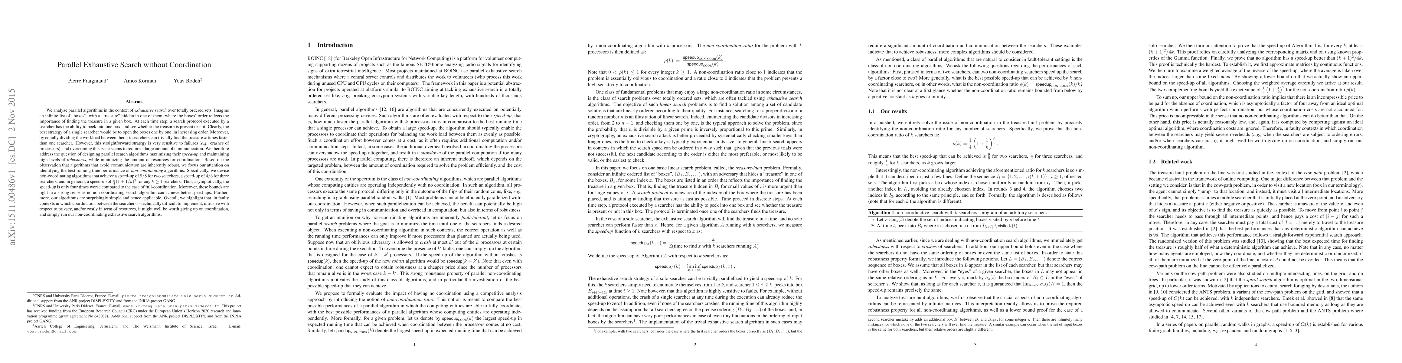 This paper explores parallel exhaustive search algorithms for finding a hidden treasure in ordered boxes, focusing on maximizing speed-up while minimizing coordination. It presents non-coordinating algorithms achieving near-optimal speed-ups, demonstrating that in contexts where coordination is impractical, these simple algorithms provide a robust alternative.
