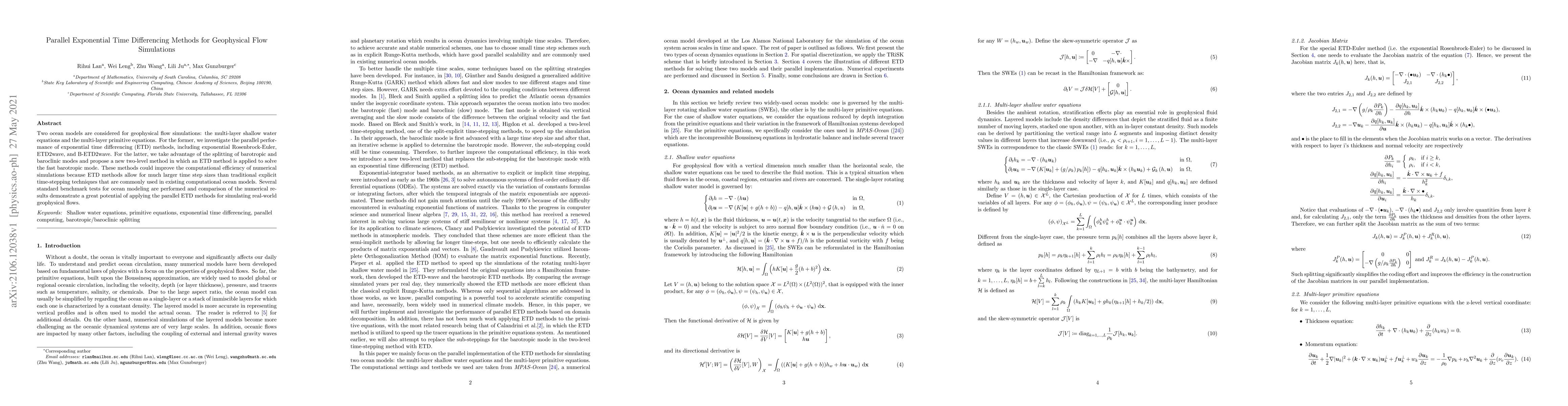 This paper explores parallel exponential time differencing (ETD) methods for simulating geophysical flows using ocean models based on the multi-layer shallow water and primitive equations. The study demonstrates improved computational efficiency through larger time step sizes compared to traditional explicit methods, validated by benchmark tests on real-world geophysical flows.