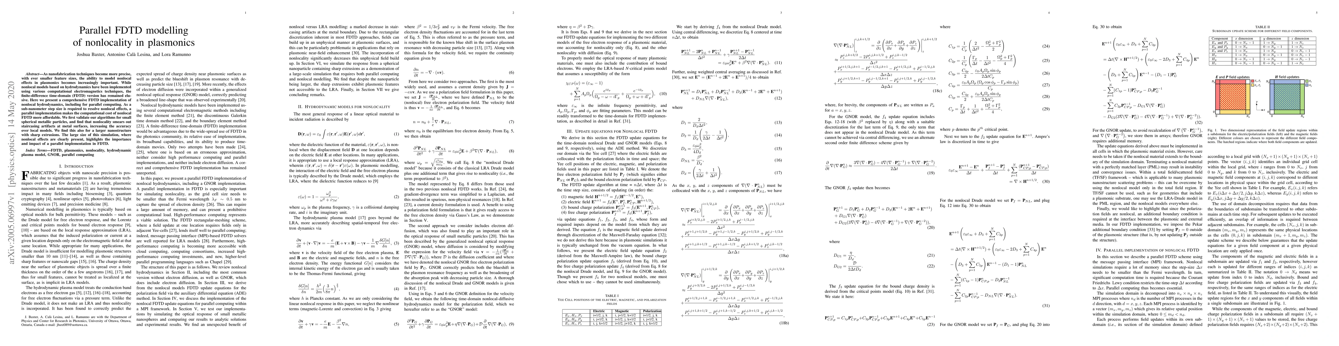 This paper presents a parallel finite-difference time-domain (FDTD) model for nonlocal effects in plasmonics, crucial for precise nanofabrication. The implementation resolves nonlocal hydrodynamics, significantly reducing computational costs and improving accuracy by eliminating staircasing artifacts in metallic particles and nanostructures.