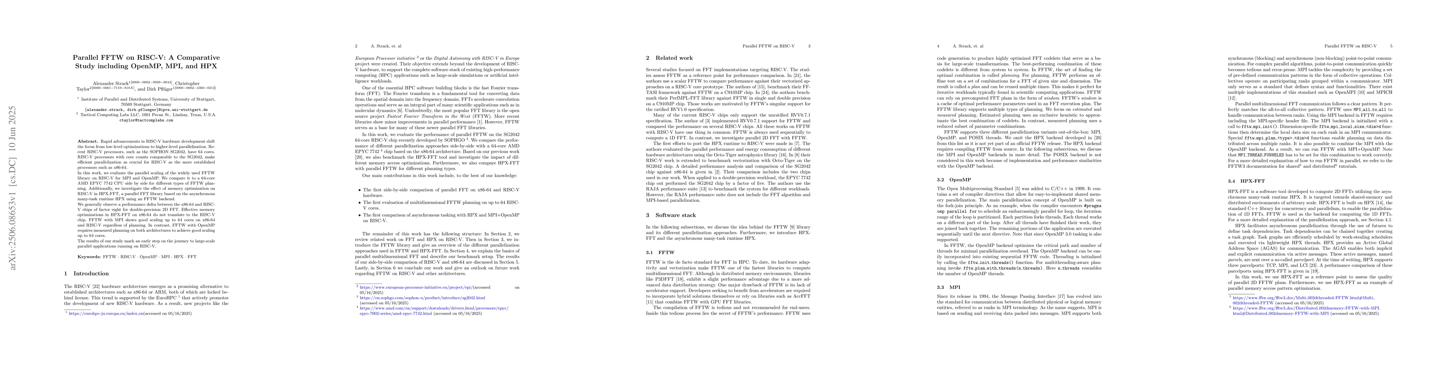 Rapid advancements in RISC-V hardware development shift the focus from low-level optimizations to higher-level parallelization. Recent RISC-V processors, such as the SOPHON SG2042, have 64 cores. RISC-V processors with core counts comparable to the SG2042, make efficient parallelization as crucial for RISC-V as the more established processors such as x86-64. In this work, we evaluate the parallel scaling of the widely used FFTW library on RISC-V for MPI and OpenMP. We compare it to a 64-core AMD EPYC 7742 CPU side by side for different types of FFTW planning. Additionally, we investigate the effect of memory optimization on RISC-V in HPX-FFT, a parallel FFT library based on the asynchronous many-task runtime HPX using an FFTW backend. We generally observe a performance delta between the x86-64 and RISC-V chips of factor eight for double-precision 2D FFT. Effective memory optimizations in HPX-FFT on x86-64 do not translate to the RISC-V chip. FFTW with MPI shows good scaling up to 64 cores on x86-64 and RISC-V regardless of planning. In contrast, FFTW with OpenMP requires measured planning on both architectures to achieve good scaling up to 64 cores. The results of our study mark an early step on the journey to large-scale parallel applications running on RISC-V.
