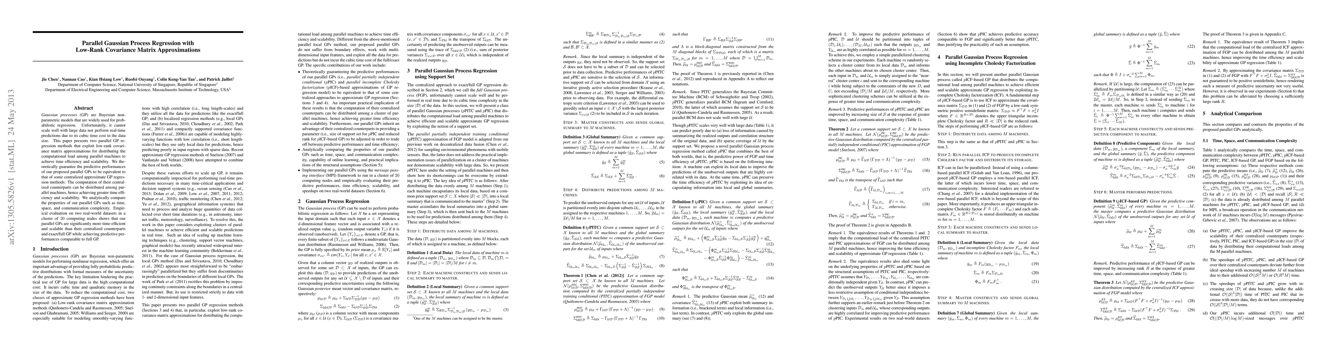 This paper introduces two parallel Gaussian process regression methods using low-rank covariance matrix approximations to enhance scalability and efficiency. The proposed methods achieve equivalent predictive performance to centralized approximate GPs while distributing computational load across parallel machines, significantly improving time efficiency and scalability.