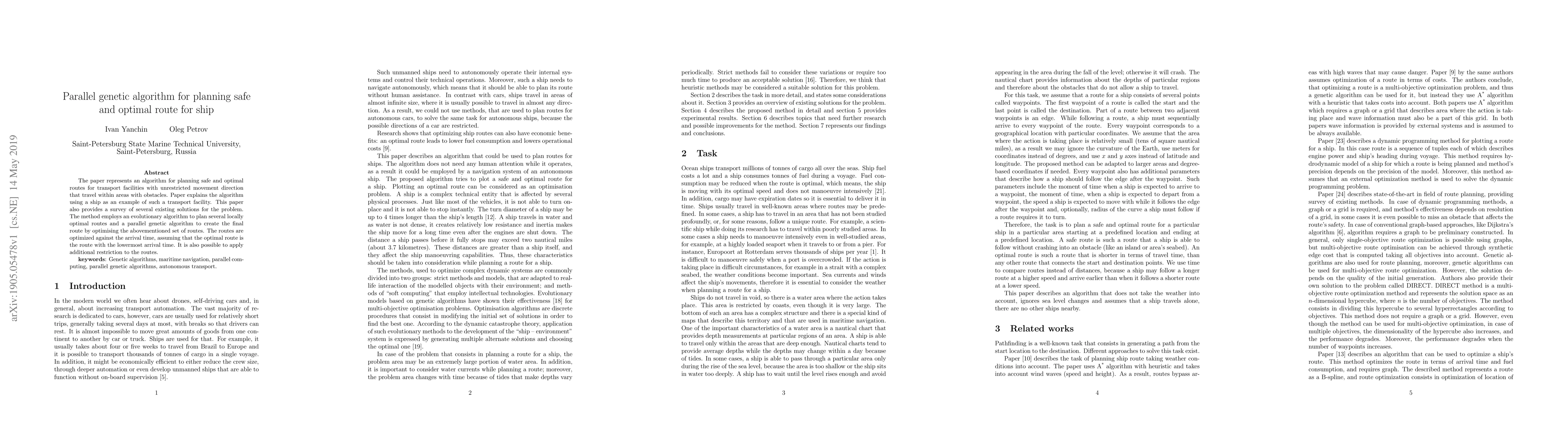 This paper proposes a parallel genetic algorithm for planning safe and optimal routes for ships navigating through obstacle-laden areas, optimizing arrival time and allowing for additional route restrictions. It compares the method with existing solutions and uses evolutionary algorithms to generate locally optimal routes.
