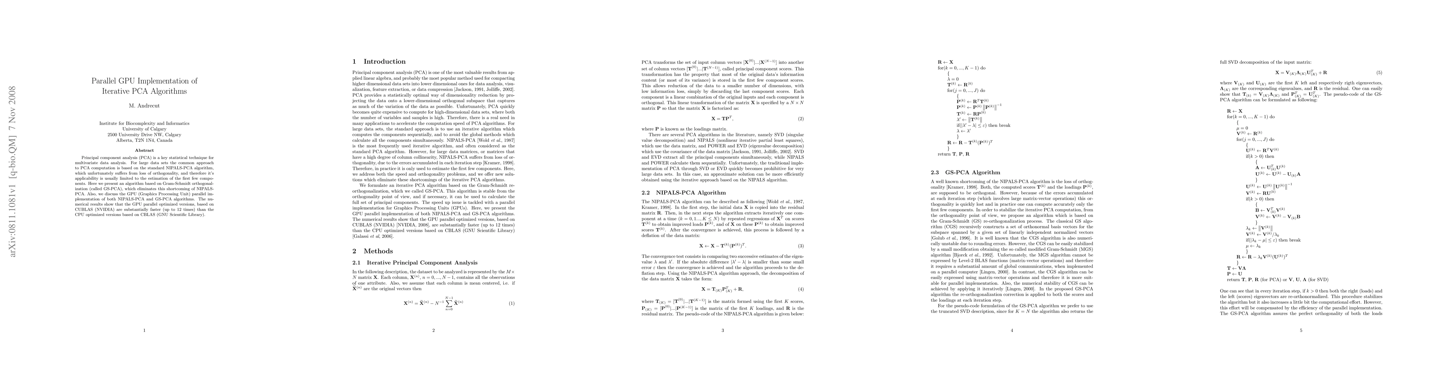 This paper presents a parallel GPU implementation of iterative PCA algorithms, specifically comparing the NIPALS-PCA and GS-PCA methods. The GS-PCA algorithm addresses the orthogonality loss issue of NIPALS-PCA, and the GPU parallel versions using CUBLAS show up to 12 times faster performance compared to CPU-optimized versions using CBLAS.