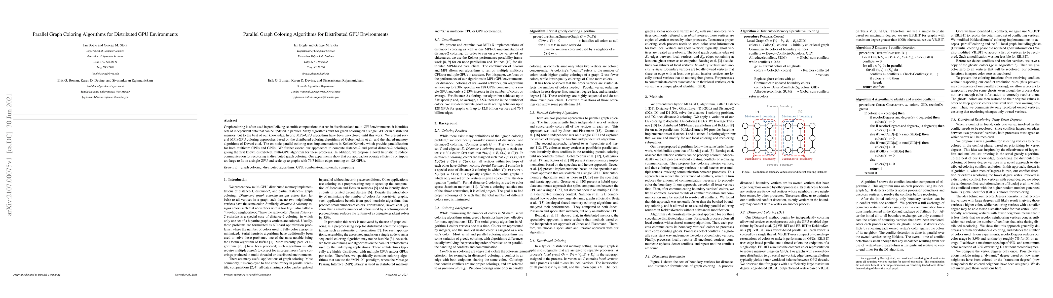 This paper presents hybrid MPI+GPU algorithms for parallel graph coloring in distributed, multi-GPU environments, extending existing distributed and shared-memory approaches. The proposed methods efficiently handle large graphs and scale up to 128 GPUs, introducing a novel heuristic to minimize communication overhead.