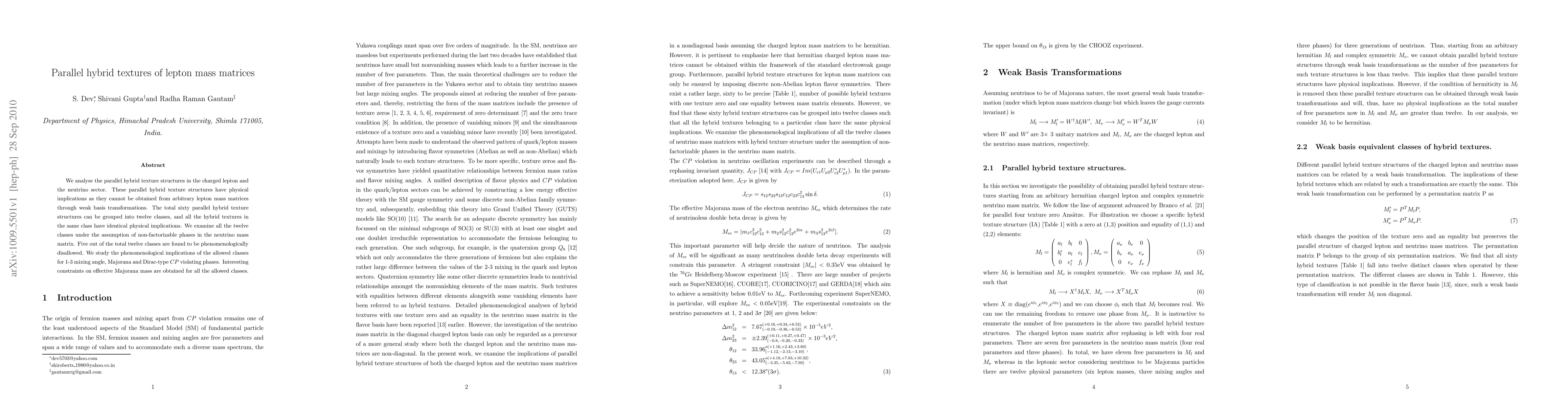 This paper analyzes parallel hybrid texture structures in the charged lepton and neutrino mass matrices, categorizing sixty structures into twelve classes with identical physical implications. It finds five classes phenomenologically disallowed and determines constraints on effective Majorana mass for the remaining allowed classes, including implications for mixing angles and CP-violating phases.