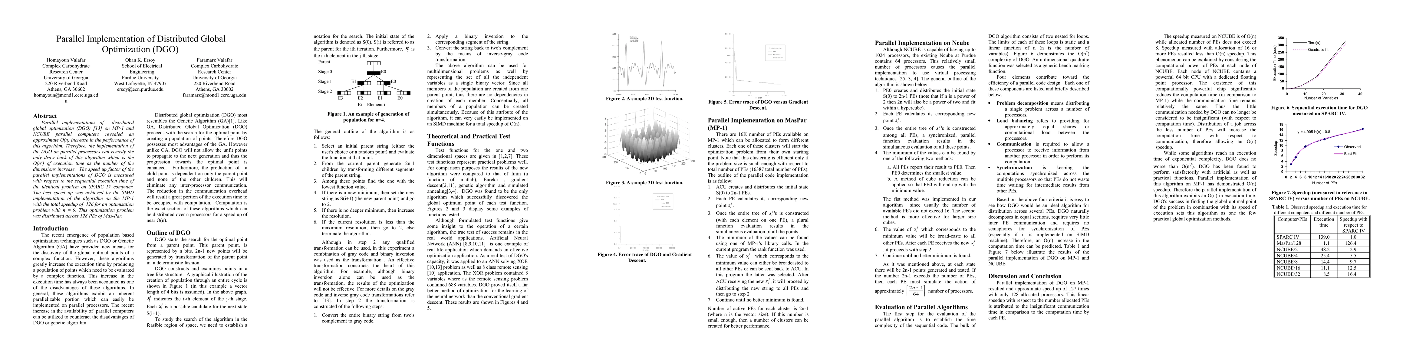 Parallel implementations of distributed global optimization (DGO) [13] on MP-1 and NCUBE parallel computers revealed an approximate O(n) increase in the performance of this algorithm. Therefore, the implementation of the DGO on parallel processors can remedy the only draw back of this algorithm which is the O(n2) of execution time as the number of the dimensions increase. The speed up factor of the parallel implementations of DGO is measured with respect to the sequential execution time of the identical problem on SPARC IV computer. The best speed up was achieved by the SIMD implementation of the algorithm on the MP-1 with the total speedup of 126 for an optimization problem with n = 9. This optimization problem was distributed across 128 PEs of Mas-Par.