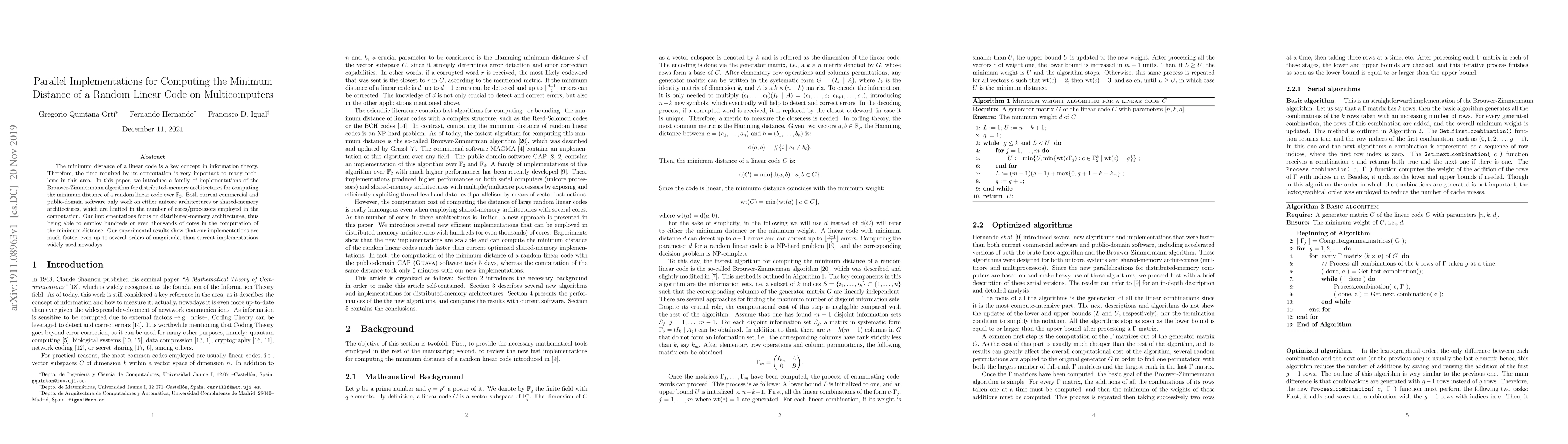 The minimum distance of a linear code is a key concept in information theory. Therefore, the time required by its computation is very important to many problems in this area. In this paper, we introduce a family of implementations of the Brouwer-Zimmermann algorithm for distributed-memory architectures for computing the minimum distance of a random linear code over F2. Both current commercial and public-domain software only work on either unicore architectures or shared-memory architectures, which are limited in the number of cores/processors employed in the computation. Our implementations focus on distributed-memory architectures, thus being able to employ hundreds or even thousands of cores in the computation of the minimum distance. Our experimental results show that our implementations are much faster, even up to several orders of magnitude, than current implementations widely used nowadays.
