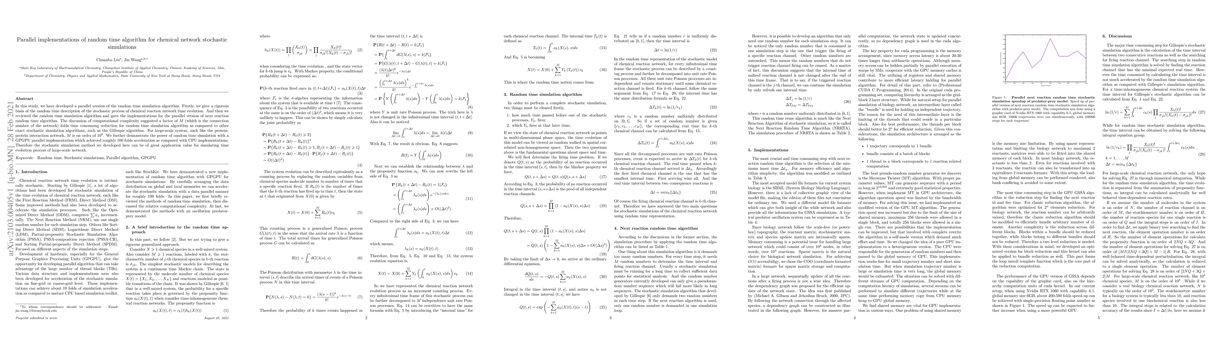 This paper presents a parallel version of the random time simulation algorithm for chemical network stochastic simulations, achieving significant computational efficiency improvements. The study demonstrates a factor of $M$ reduction in time consumption compared to other methods, with a GPGPU implementation achieving roughly 100 times faster performance than CPU implementations, making it highly valuable for large-scale network simulations.