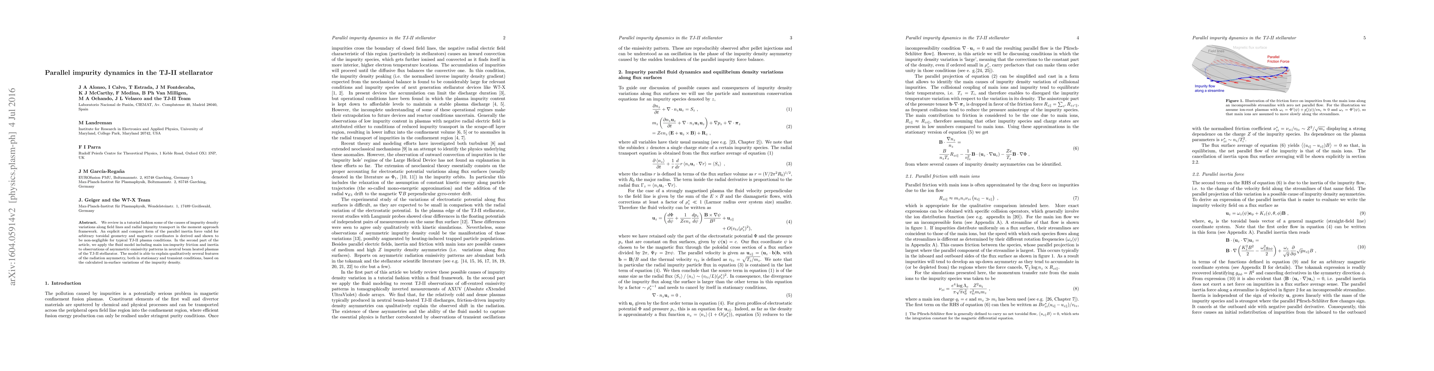 This paper reviews impurity transport dynamics in the TJ-II stellarator, deriving a significant parallel inertia force for typical plasma conditions. It applies a fluid model incorporating ion-impurity friction and inertia to explain asymmetric emissivity patterns observed in neutral beam heated plasmas, attributing these to variations in impurity density.