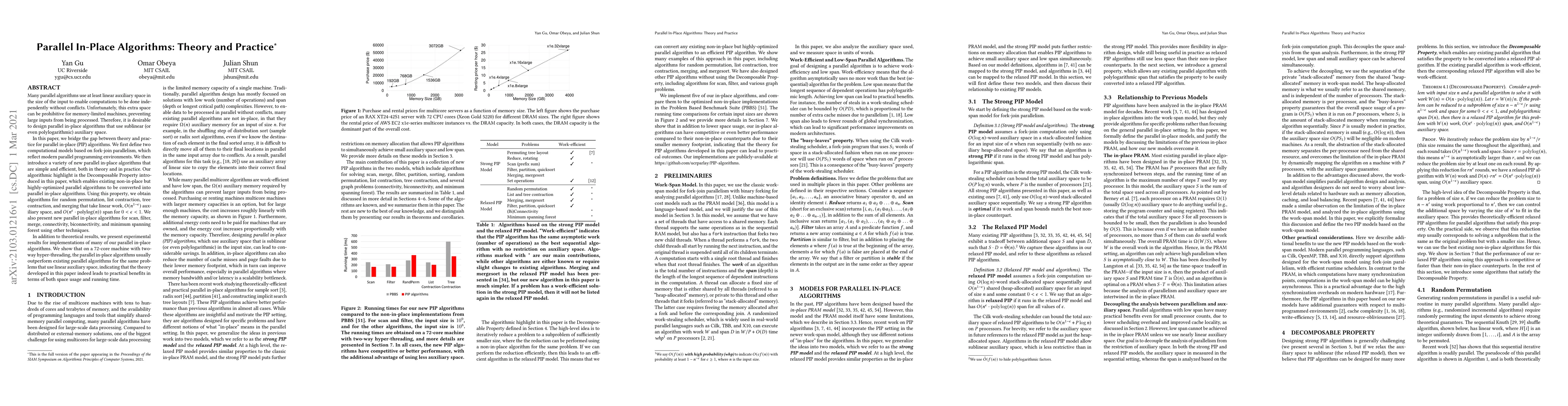 Many parallel algorithms use at least linear auxiliary space in the size of the input to enable computations to be done independently without conflicts. Unfortunately, this extra space can be prohibitive for memory-limited machines, preventing large inputs from being processed. Therefore, it is desirable to design parallel in-place algorithms that use sublinear (or even polylogarithmic) auxiliary space. In this paper, we bridge the gap between theory and practice for parallel in-place (PIP) algorithms. We first define two computational models based on fork-join parallelism, which reflect modern parallel programming environments. We then introduce a variety of new parallel in-place algorithms that are simple and efficient, both in theory and in practice. Our algorithmic highlight is the Decomposable Property introduced in this paper, which enables existing non-in-place but highly-optimized parallel algorithms to be converted into parallel in-place algorithms. Using this property, we obtain algorithms for random permutation, list contraction, tree contraction, and merging that take linear work, $O(n^{1-\epsilon})$ auxiliary space, and $O(n^\epsilon\cdot\text{polylog}(n))$ span for $0<\epsilon<1$. We also present new parallel in-place algorithms for scan, filter, merge, connectivity, biconnectivity, and minimum spanning forest using other techniques. In addition to theoretical results, we present experimental results for implementations of many of our parallel in-place algorithms. We show that on a 72-core machine with two-way hyper-threading, the parallel in-place algorithms usually outperform existing parallel algorithms for the same problems that use linear auxiliary space, indicating that the theory developed in this paper indeed leads to practical benefits in terms of both space usage and running time.