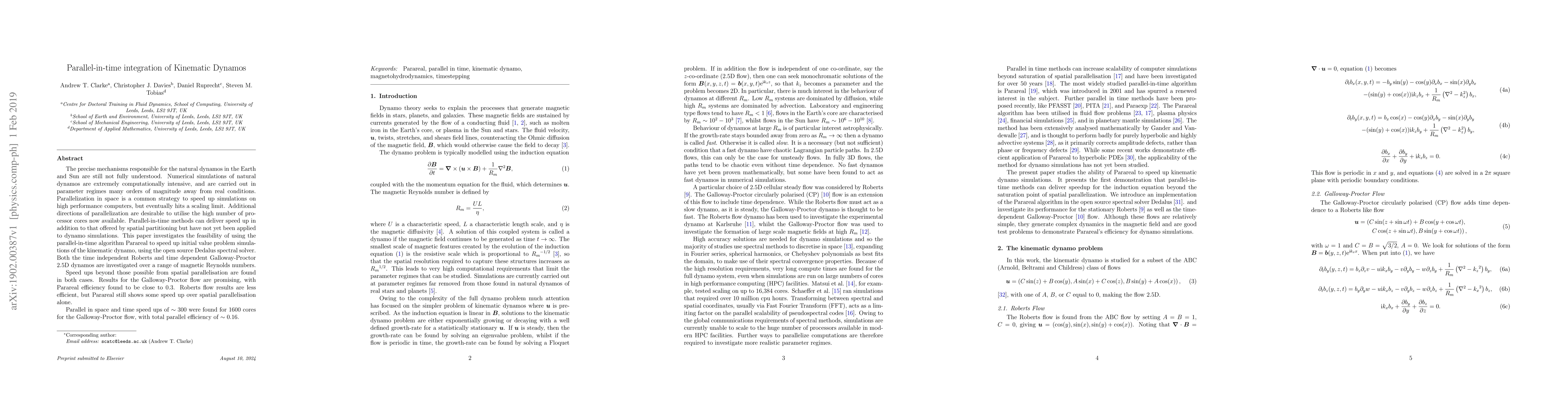 This paper explores the application of the parallel-in-time Parareal algorithm to enhance the computational efficiency of kinematic dynamo simulations, demonstrating significant speed ups beyond spatial parallelization alone, particularly for the Galloway-Proctor flow, achieving a parallel efficiency of nearly 0.3 and a total speed up of approximately 300 with 1600 cores.
