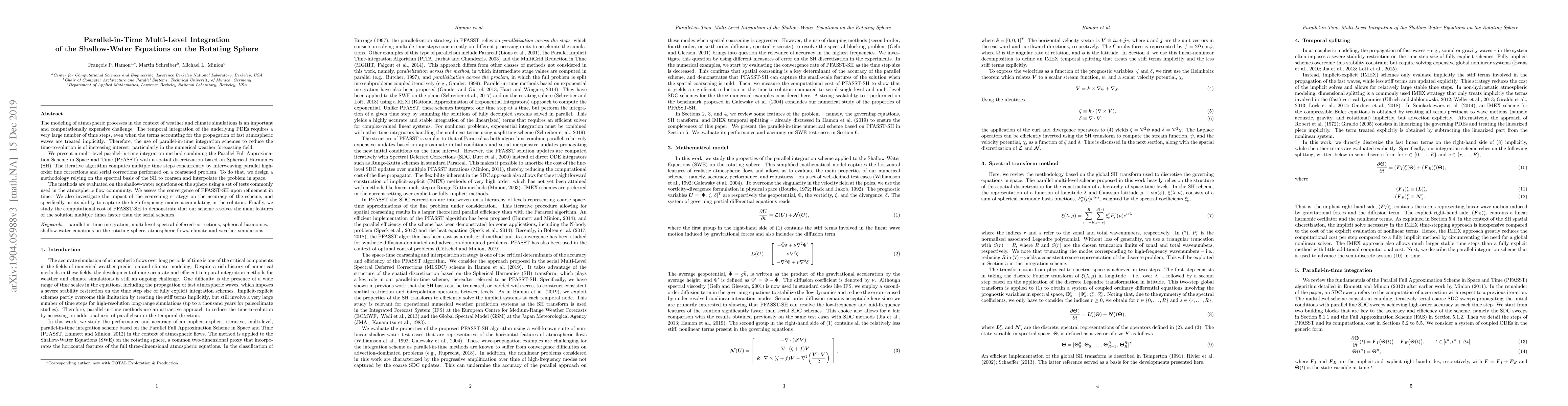 This paper presents a multi-level parallel-in-time integration method combining PFASST with Spherical Harmonics for the shallow-water equations on the rotating sphere, aiming to reduce computational costs in atmospheric simulations. The method shows improved convergence and faster resolution compared to serial schemes.