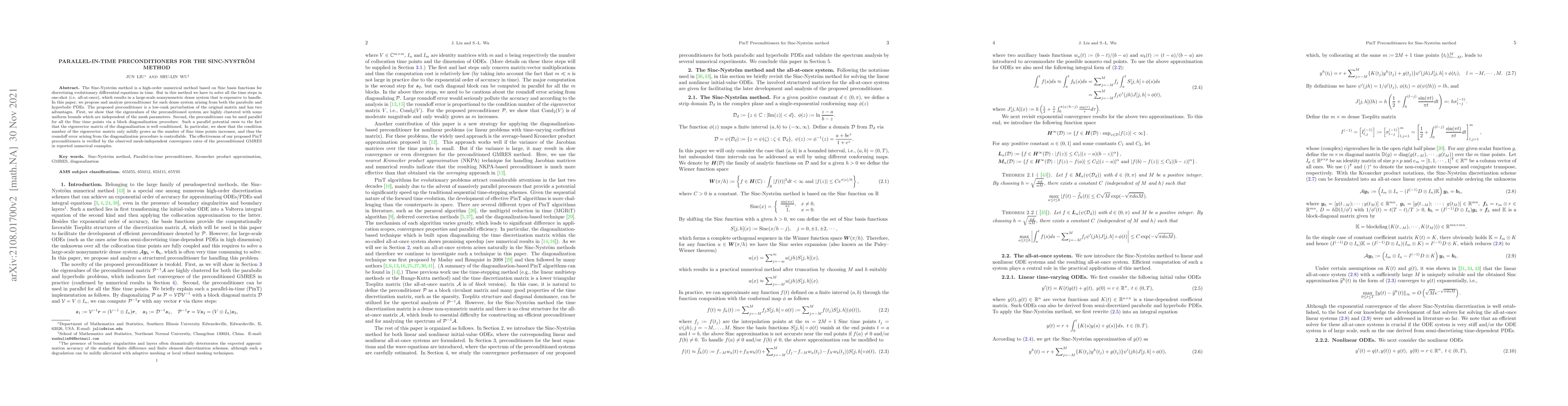 The Sinc-Nystr\"{o}m method is a high-order numerical method based on Sinc basis functions for discretizing evolutionary differential equations in time. But in this method we have to solve all the time steps in one-shot (i.e. all-at-once), which results in a large-scale nonsymmetric dense system that is expensive to handle. In this paper, we propose and analyze preconditioner for such dense system arising from both the parabolic and hyperbolic PDEs. The proposed preconditioner is a low-rank perturbation of the original matrix and has two advantages. First, we show that the eigenvalues of the preconditioned system are highly clustered with some uniform bounds which are independent of the mesh parameters. Second, the preconditioner can be used parallel for all the Sinc time points via a block diagonalization procedure. Such a parallel potential owes to the fact that the eigenvector matrix of the diagonalization is well conditioned. In particular, we show that the condition number of the eigenvector matrix only mildly grows as the number of Sinc time points increases, and thus the roundoff error arising from the diagonalization procedure is controllable. The effectiveness of our proposed PinT preconditioners is verified by the observed mesh-independent convergence rates of the preconditioned GMRES in reported numerical examples.