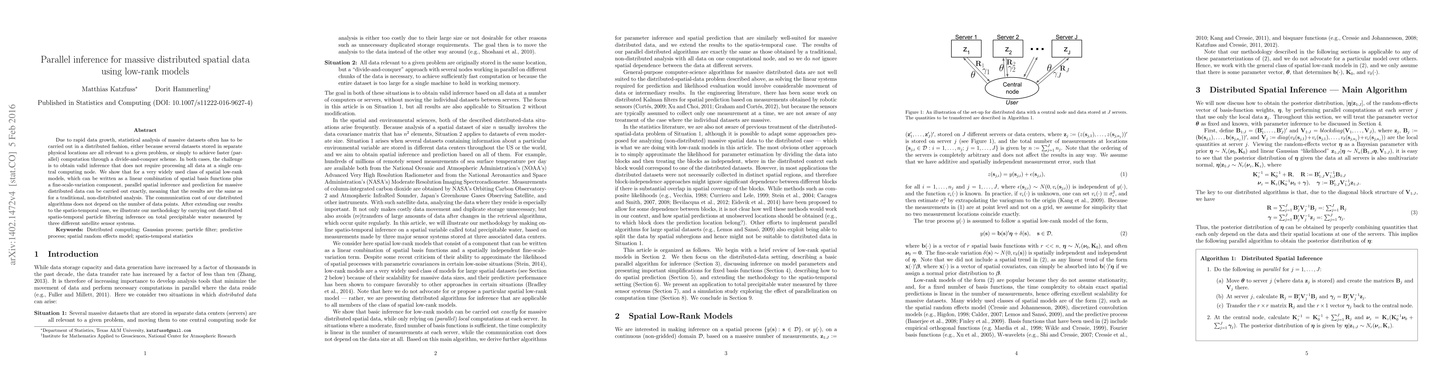 This paper proposes a method for parallel inference on massive distributed spatial data using low-rank models, ensuring exact results without central processing. The distributed algorithms have constant communication cost regardless of data size, and the approach is demonstrated through spatio-temporal particle filtering on satellite data.