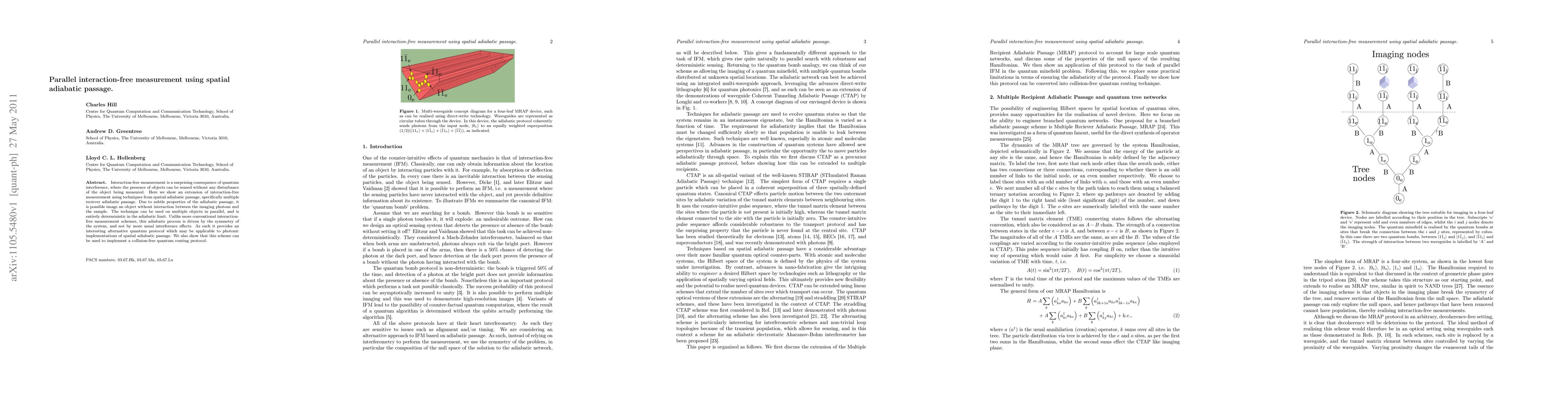 This paper presents a novel parallel interaction-free measurement technique using spatial adiabatic passage, enabling object imaging without disturbing the object. This method is deterministic and driven by system symmetry rather than interference, offering a new quantum protocol for photonic applications and collision-free quantum routing.